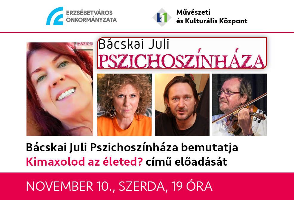 Bácskai Juli Pszichoszínháza bemutatja Kimaxolod az életed? c. előadását november 10-én 19.00 órakor. Főszerepben Szalontay Tünde és Kocsis Pál