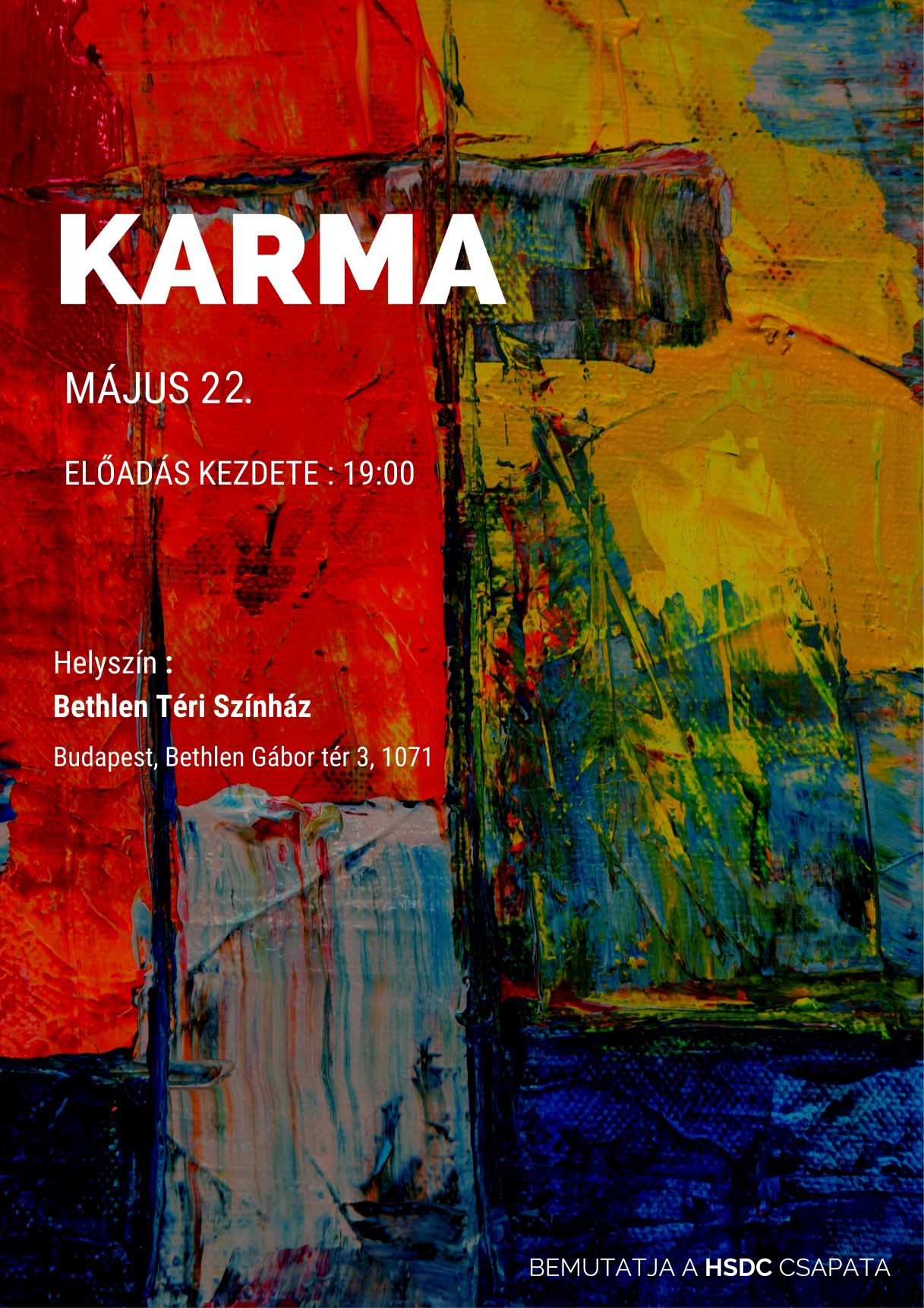 Formabontó produkcióval várja az érdeklődőket a HSDC táncosai, akik első színházi első, KARMA című színházi előadásukkal lépnek fel a Bethlen Téri Színházban. A formáció tagjai tematikusan csokorba fűzve mutatják be az elmúlt két évük munkáját, melyet nyílt eseményként, úgy nevezett street színházi produkcióként tűz műsorára a Bethlen Téri Színház.