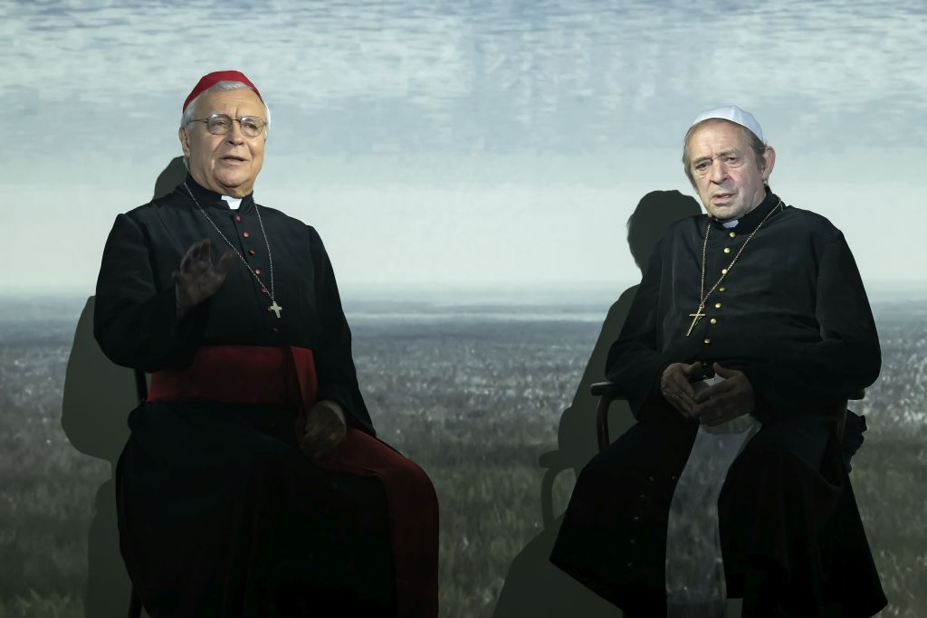 Benedek – pápasága előtt Joseph Ratzinger bíboros – a dogmák védelmezője, érsek korában Isten rottweilerének is nevezték. Bergoglio bíboros (Ferenc pápa) karizmatikus, életvidám argentin, szerény. A konzervatív Benedek Mozartot játszik, a progresszív Bergoglio Beatlest dúdol. Előbbi semmilyen sportért nem rajong, utóbbi nagy focirajongó. A darab a két pápa elképzelt teológiai vitáit mutatja be. A mű elmélkedésre késztet, és mer humoros is lenni.