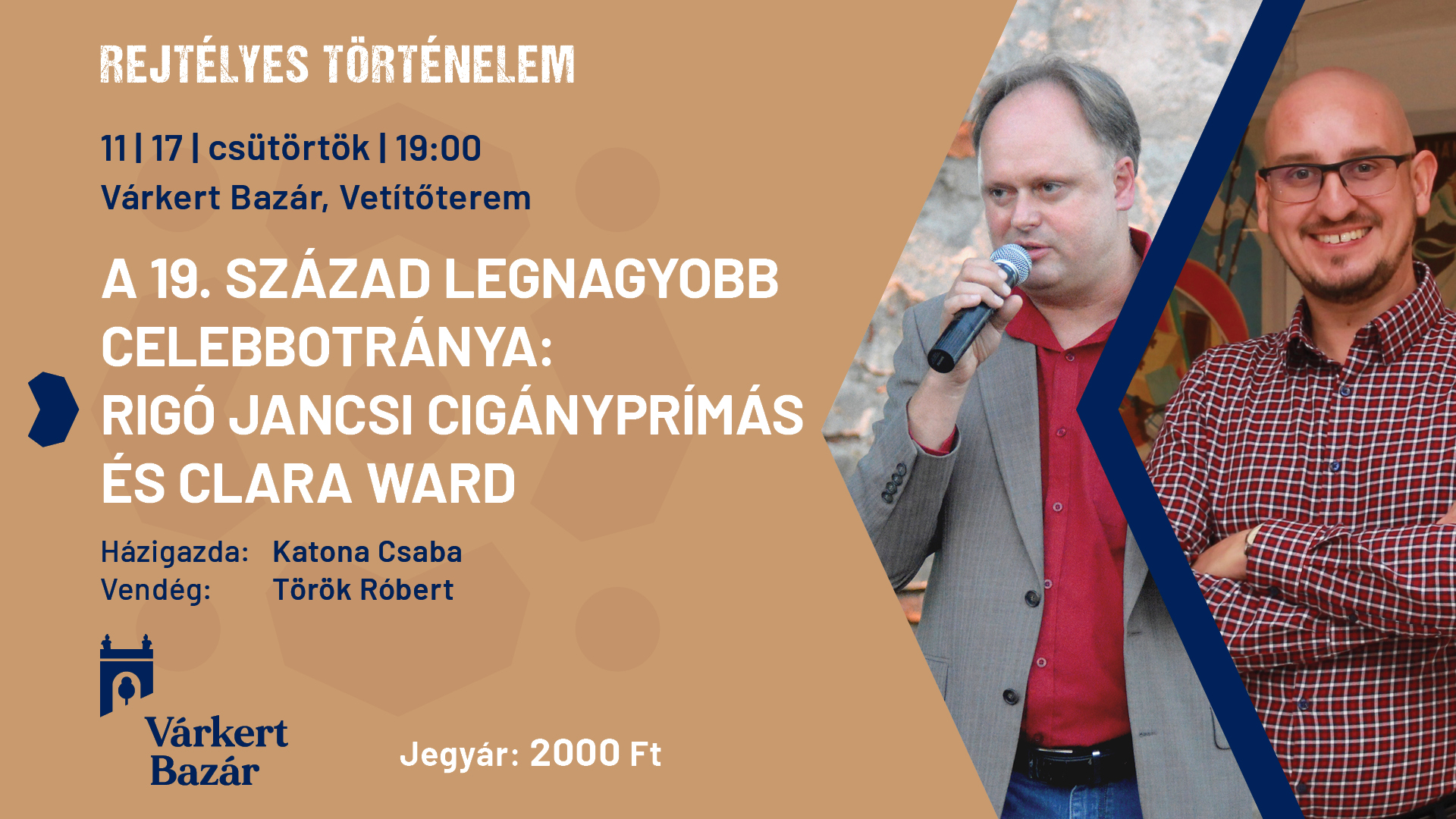 A pákozdi szegénysoron született híres cigányprímás a 19. század végén Párizsban ismerte meg a gazdag chicagói családból származó belga hercegné, Clara Wardot. Az ismeretségből szerelem lett, mindketten elváltak, majd összeházasodtak. A botrányos rangon aluli házasság Ausztráliától Amerikáig tematizálta a közbeszédet. Az este során Rigó Jancsi és Clara Ward kalandos életét is megismerhetjük.