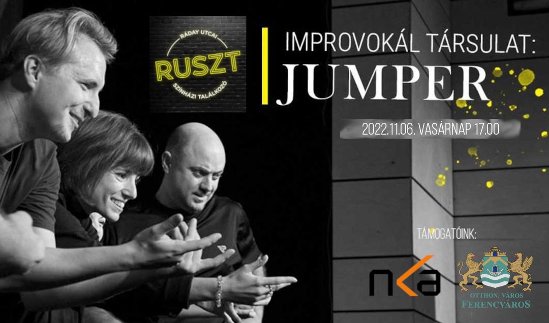 Az Improvokál Társulat Jumper című előadása a RUSZT 3 napos fesztiválon kerül megrendezésre, a fesztivál támogatói: NKA, Budapest Főváros IX. kerületi Ferencváros önkormányzata