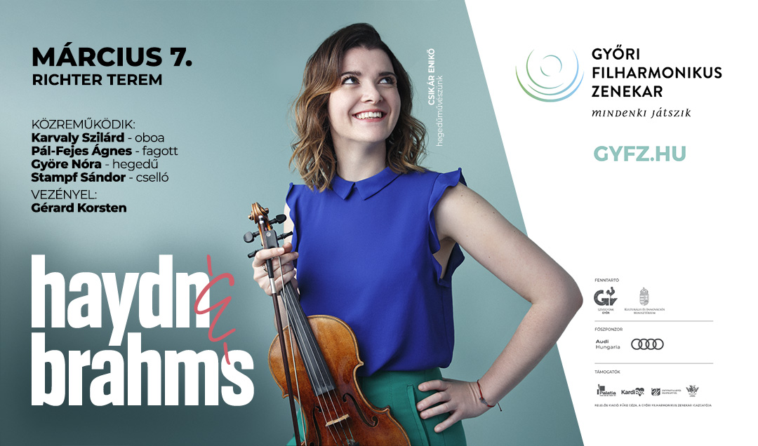 A variáció-műfaj fontos szerepet tölt be Brahms életművében: önálló művekben éppúgy megtaláljuk, mint többtételes ciklusok részeként, zongorazenéjében éppúgy, mint zenekari kompozícióiban. A Változatok egy Haydn-témára mindkét utóbbi kategóriába beleillik: zenekarra és két zongorára egyaránt megkomponálta a zeneszerző. Jóllehet a cím a bécsi klasszika nagy mesterére utal, ma már tudjuk: a téma nem Haydntól való – ez a tény azonban mit sem von le a pompás kompozíció értékéből. Joseph Haydn az 1790-es évek első felében két igen sikeres hangversenykörutat tett Londonban: az első utazás során keletkezett a derűs Sinfonia concertante, amely nem kevesebb, mit négy muzsikusnak kínál hálás szólószerepet – a magánszólamokban ezúttal a Győri Filharmonikus Zenekar szólamvezető művészei remekelnek. A Nikisch-bérletben megrendezett hangverseny második félidejében a 19. század szimfonikus zenéjének egyik alapműve, Brahms a kortársak által a bemutató után hamarosan csak Beethoven 10. szimfóniájaként emlegetett, impozáns 1. szimfóniája csendül fel. A Győri Filharmonikus Zenekart a világszerte ismert kiváló karmester, Gérard Korsten vezényli.