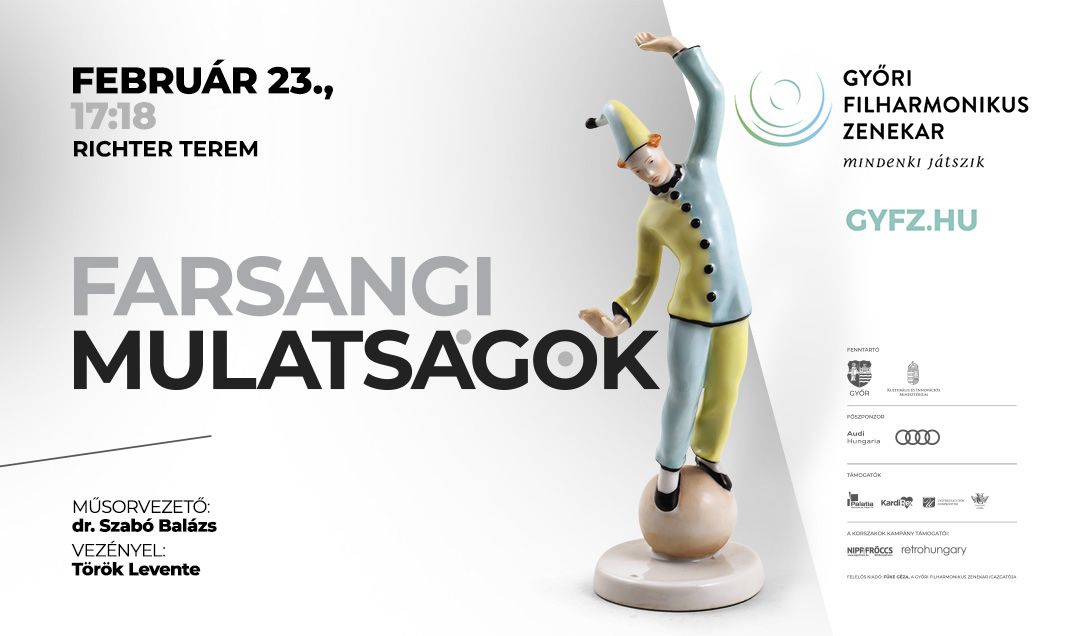A 17:18-as bérlet második estjének programját a farsang jegyében állította össze a Győri Filharmonikus Zenekar. A program első részében Hacsaturjan 1944-ben készült öt tételes Álarcosbál-szvitje hangzik el, amely a Lermontov drámájához 1941-ben komponált kísérőzene részleteit fűzi csokorba – legismertebb tétele a Keringő, amelyet minden bizonnyal az is ismer, aki a szerző nevét sem hallotta… A koncert második felében jeles zenei jubileumot köszönthetünk: 200 éve született Bécs zenetörténetének egyik legjelentősebb muzsikusa, az emberiséget megannyi szívhez szóló melódiával megajándékozó „keringőkirály”, ifj. Johann Strauss. Elegáns keringői, vidám polkái, lendületes indulói immár sok-sok generáció számára nyújtanak örömteli perceket a mindennapok rohanásában, ébresztenek édes – esetleg fájdalmas – emlékeket. A Győri Filharmonikus Zenekar ezúttal az életmű néhány ismert örökzöldjével kedveskedik a közönségnek. A hangverseny dirigense Török Levente, a Miskolci Szimfonikusok vezető karmestere, házigazdája dr. Szabó Balázs zenetörténész lesz.