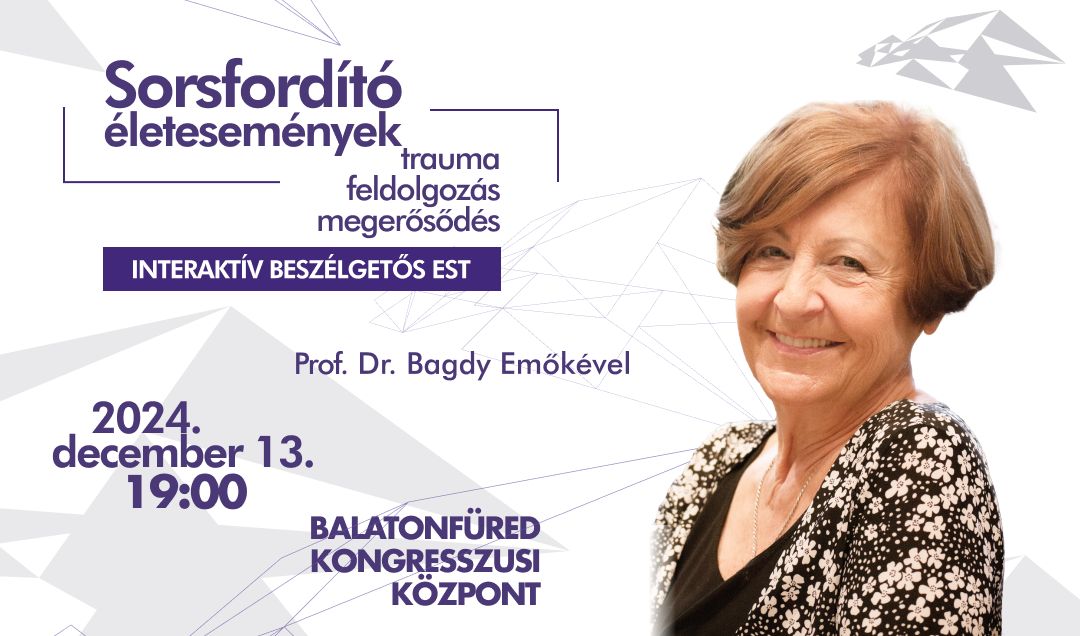 A jó dolgok mellett a veszteségek is az élet természetes velejárói. Egyszer fent, máskor lent – szokták mondani. Ezen az előadáson a hétköznapi nehézségeken túli traumatikus helyzetekről fogunk beszélgetni. Olyanokról, amik alapvetően változtatják meg az életünk addigi folyását. Egy válás, egy komoly betegség, a szeretett hozzátartozó elvesztése, anyagi csőd…a sorsfordító életesemények senkit nem kímélnek, a kérdés az, hogy hogyan tudjuk kezelni ezeket. Mitől függ a lelki ellenálló képesség (rezíliencia), az, hogy kit mennyire visel meg, ha „padlóra kerül”? Tudunk-e segítséget kérni? Milyen stádiumai vannak a felépülésnek, és a sokszor küzdelmes belső munka miként formálja a személyiségünket? Mit takar pontosan a poszttraumás növekedés fogalma, hogy lehetséges végül javunkra fordítani a ránk mért sorscsapásokat? Prof.Dr.Bagdy Emőke Prima Primissima díjas klinikai szakpszichológus hatalmas élettapasztalat és szakmai tudás birtokában érkezik segíteni a balatonfüredi közönséghez.