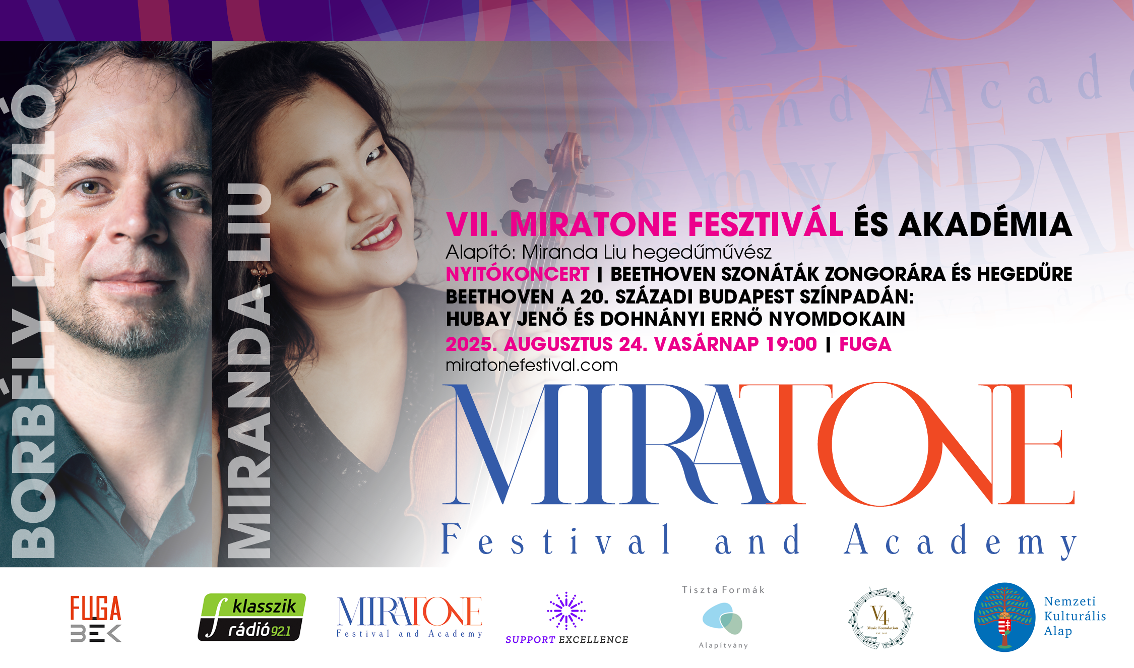 A fesztivál hagyományaihoz hűen idén is Beethoven kamarazenéje nyitja meg az ünnepi hetet. A koncert különlegessége nemcsak a kiválasztott művek szépségében rejlik, hanem történelmi visszatekintésében is: az est műsorát Hubay Jenő és Dohnányi Ernő legendás, 1918-as koncertje ihlette, ahol ugyanezek a darabok csendültek fel. A hangverseny így egyfajta időutazás a 20. század eleji pezsgő budapesti koncertéletbe – kortárs tolmácsolásban. Beethoven tíz hegedű-zongora szonátájának három, viszonylag korai, mégis karakteres darabja hangzik el Miranda Liu és Borbély László előadásában. A két művész összeszokott kamarapartnerekként lép színpadra, közös zenei nyelvüket a sokéves együttműködés és finom kamarazenei érzékenység jellemzi. A finoman megformált A-dúr szonátát követően a népszerű, életörömmel teli „Tavaszi” szonáta idézi meg a természet frissességét, végül a szenvedélyes c-moll szonáta zárja az estet. Az est egyúttal meghívás is: köszöntsük együtt a VII. MiraTone Fesztivált, és engedjük, hogy Beethoven zenéje – több mint kétszáz év távlatából – ma is élő, inspiráló és személyes élménnyé váljon.