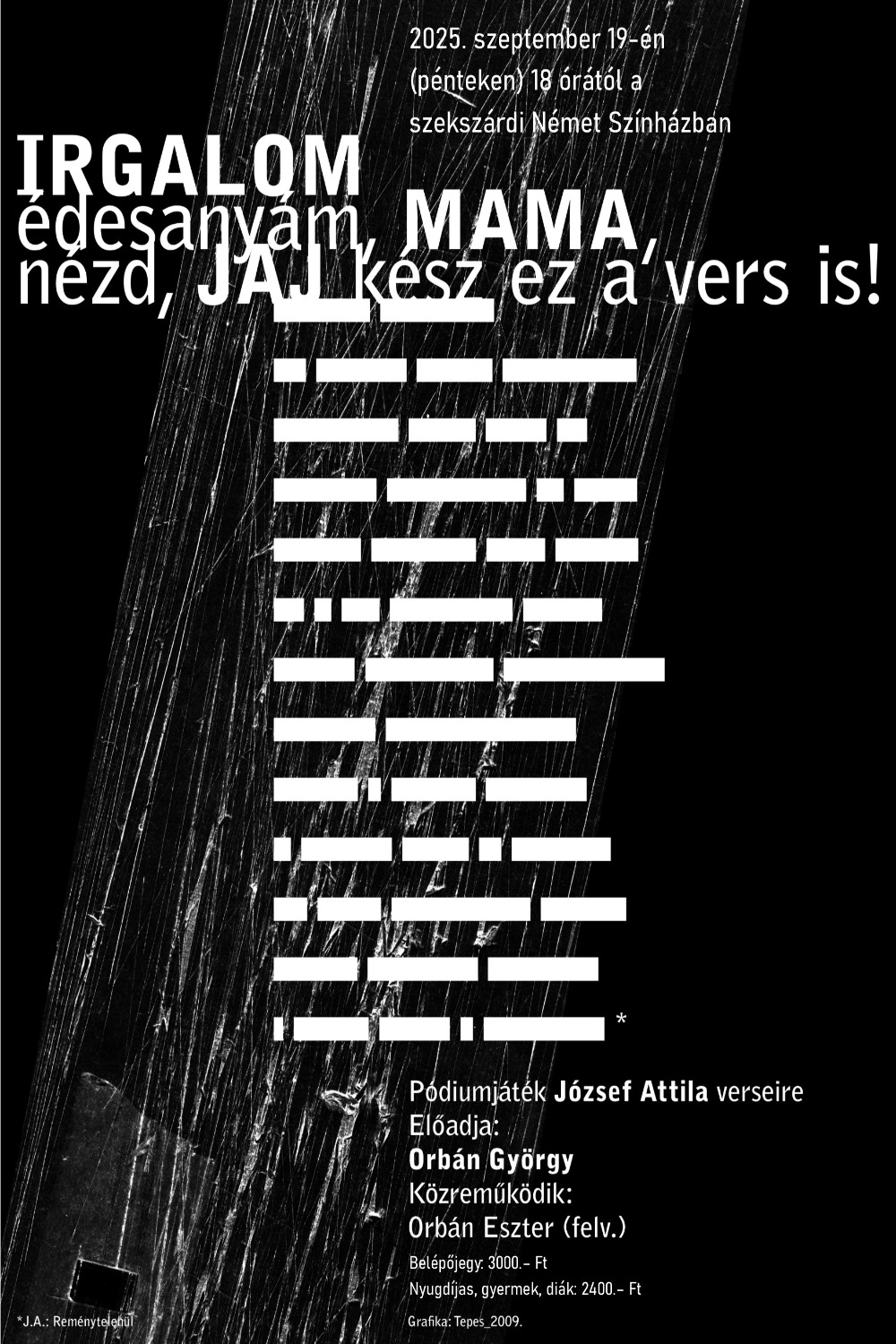 Kevés olyan költő van, akinek személyes életpályája, útkeresése, kudarcai, már-már szükségszerű összeomlása annyira nyomon követhető lenne műveiben, mint a 120 éve született József Attila. A magyar irodalom egyik legmeghatározóbb alkotójának versein alapuló monodrámában – mely most felújításban jelenik meg a DBU színpadán – Orbán György idézi meg a 120 éve született lírikus arcait. A szuggesztív és megrázó előadásban egyszerre tűnik föl a korszakokon átívelő zseni és a felnőtté válni soha nem tudó gyermek determináltan tragikus sorsa.