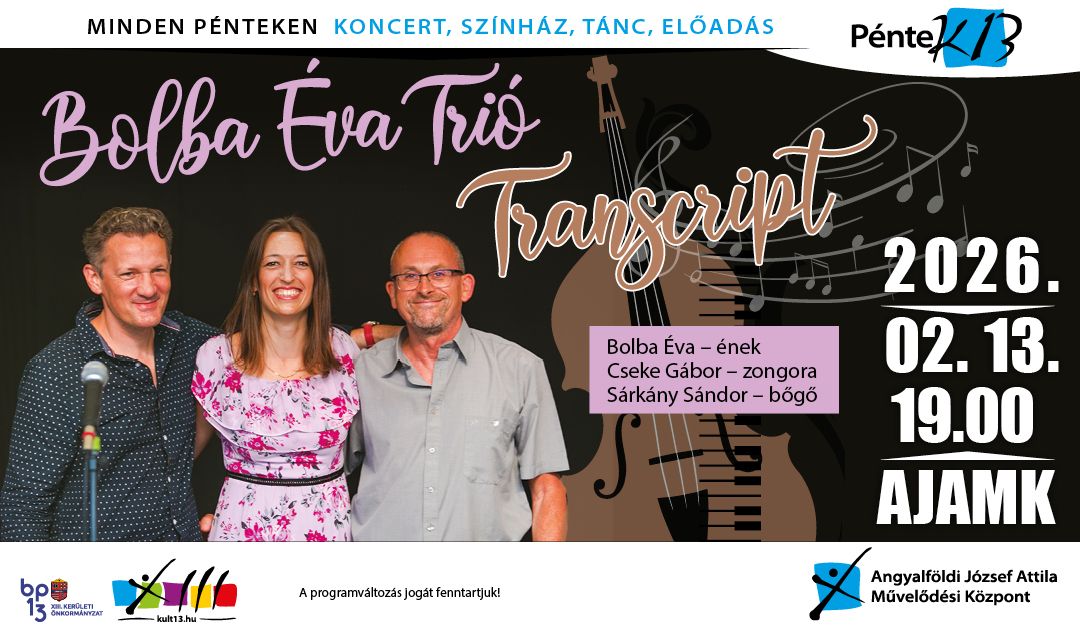 A jazz műfaj egyediségét a benne rejlő szabadságnak köszönhetjük. Ennek oka nem csupán az improvizáció, hanem az örök érvényű sztenderd dallamok és harmóniák variálhatóságának kimeríthetetlen tárháza. A Bolba Éva Trió “Transcript” című műsorának egyedisége egy folyamat eredménye, amely arra hivatott, hogy közönség elé tárja a három kiváló művész újszerű elgondolását a már ismert sztenderd dallamokról. A műsor tökéletesen átgondolt, újszerű megfogalmazása egy belső utazás, amelyet a kiemelkedő tehetségű Cseke Gábor szakértelemmel és kifinomult ízléssel alkotott meg a zenekar számára. A fordulatokban gazdag, kiváló hangszerelések teret engednek a zongora, bőgő és az ének kreatív kibontakozására. A nagyszerű összhangban működő trió biztos alapjául Sárkány Sándor gazdag technikai játéka szolgál, amely nagyban elősegíti az érzelmek teljes skáláját felvonultató Bolba Éva játékát a hangokkal.