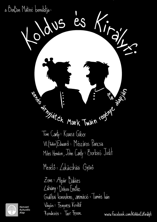 Ki ne próbált volna különböző figurákat vetíteni a falra úgy, hogy a kezeit hátulról egy lámpával világítja meg? Nagyjából ez az alapja az árnyékszínház műfajának. Ezen egyszerű trükkhöz azonban számos, jóval bonyolultabb is kapcsolódik ezen az előadáson. A Koldus és királyfi című mese, Mark Twain regénye, mint minden remekmű, egy örök történet. Végső soron azt kutatja, az ember mitől, kitől az, ami. És elbeszéli azt is, amit már sokszor és sokan elárultak, hogy legkevésbé sem a külsőségektől. Nem véletlen, hogy keletkezése óta számtalanszor feldolgozták történetét, azonban a BonBon Árnyékszínház előadásához hasonlóan, tudomásunk szerint még soha. Különleges ez az előadás több szempontból is:
