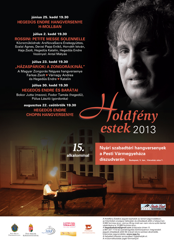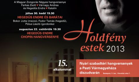 Idén is sok szeretettel ajánljuk zeneszerető barátaink figyelmébe a Holdfény Estek nyári koncertsorozatot, mely a hagyományokhoz híven a Pesti Vármegyeháza díszudvarán kerül megrendezésre. Ez az udvar egyfajta sziget, amely kirekeszt minden fölösleges zajt, csak hogy csendjét betölthesse Mozart, Chopin, Mendelssohn, Brahms, Rossini és Liszt zenéjének varázslatos ereje." (Hegedűs Endre és Katalin)