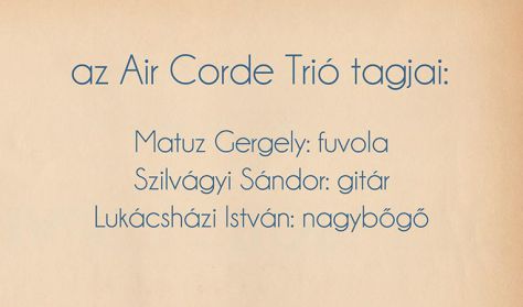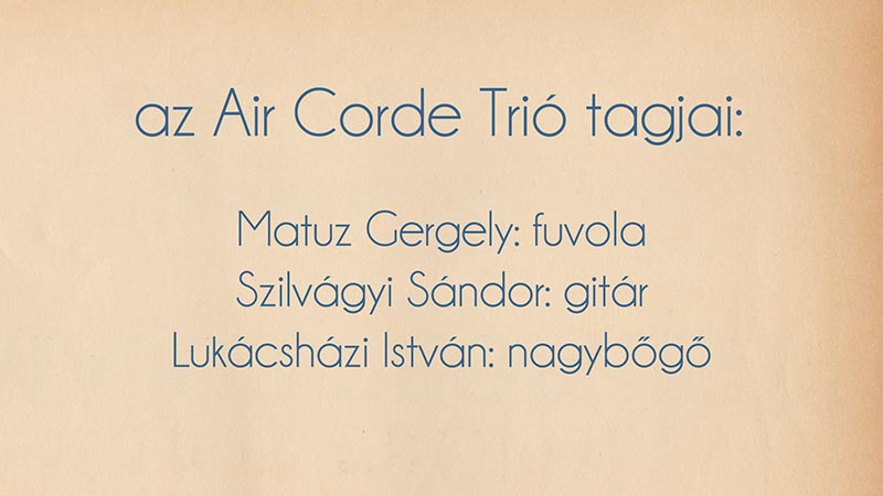 Sokan gondolják, hogy a komolyzene komoly. Pedig egyáltalán nem az! Ezért mi úgy is nevezzük: klasszikus zene. A legtöbben nem is tudják, hogy a legnagyobb zeneszerzők is mennyi játékot, humort csempésztek darabjaikba. Az Air Corde Trió műsora a leghíresebb zeneszerzők leghíresebb műveit adja elő, melyeket kutyák, hattyúk, elefántok, dongók és még ki tudja hány és miféle állatok inspiráltak. A rendkívül szórakoztató műsor kiváló bevezetést nyújt gyerekeknek – és felnőtteknek egyaránt – a klasszikus zene világába. A műsorban olyan klasszikus szerzőktől hallhatnak darabokat, mint Vivaldi, Rossini, Saint-Saens, Gossec, Sári László, Rimszkij-Korszakov, Honegger. Az együttesben Matuz Gergely fuvolaművész, Szilvágyi Sándor gitárművész és Lukácsházi István nagybőgőművész szerepel. Őket egészíti ki Dobos Emőke rajzművész, aki digitálisan készített illusztrációi révén segít a gyerekeknek eligazodni ebben a zenei állatkertben.