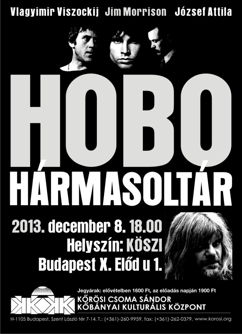 Jim Morrison - József Attila - Vlagyimir ViszockijHobo hármasoltárát József Attila költő, Jim Morrison, a The Doors énekese és dalszövegírója, valamint Vlagyimir Viszockij színész, énekes, költő, a '60-as, '70-es évek orosz bálványa alkotják. A Kossuth-díjas énekes, dalszerző, szövegíró, színész, előadóművész, Földes László, Hobo előadásában a mesterek tiszteletére szólal meg.