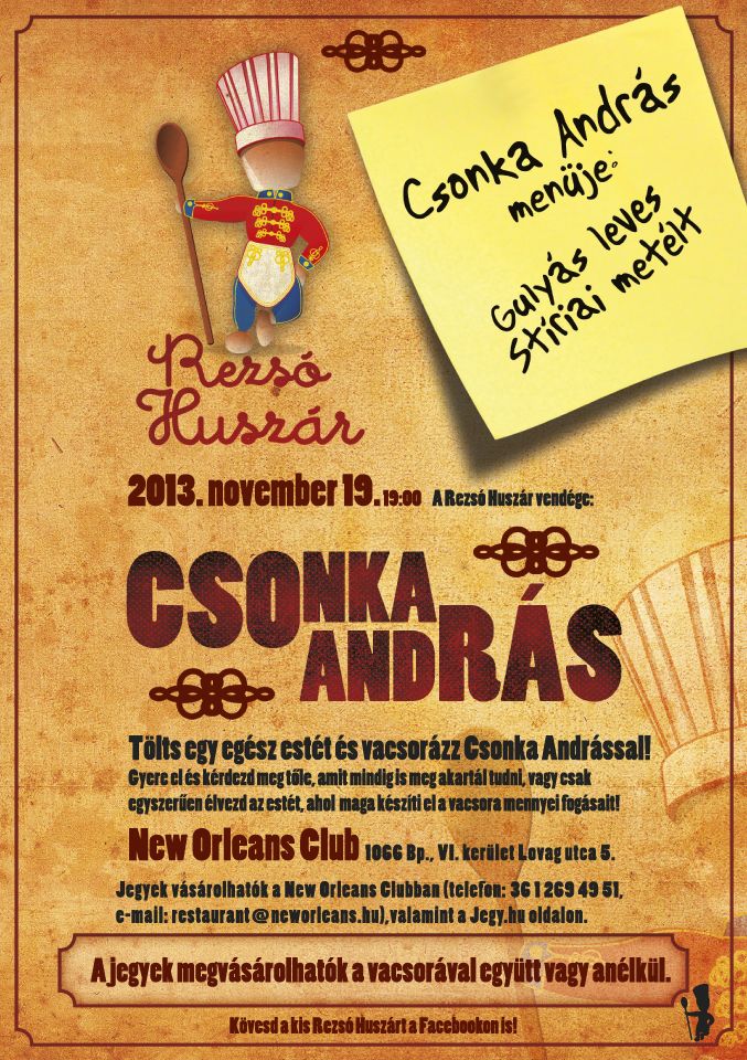 Rezsó Huszár: új talkshow a New Orleans Clubban! Adott egy népszerű közéleti személyiség (színész, zenész, divattervező, író, költő, sportoló vagy akár egy self made man), akiről a bulvár médiának köszönhetően sok mindent tudhat a közönség, így aztán azt is sejtheti, hogy favoritja szeret-e a konyhában sürgölődni. Ami azonban valószínű: főztjét még sosem kóstolta! Így ez az apropó szülte a műsor gondolatát, amiből valóság lett.A talkshow első vendége: Csonka András, vagy ahogy mindenki ismeri, Csonka Pici, színész, műsorvezető, aki mára már egy gazdag zenei karriert is magáénak tudhat.
