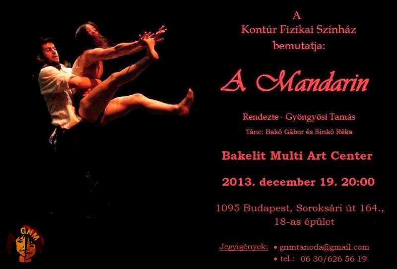 Lengyel Menyhért: A csodálatos Mandarin című műve alapján készült előadásunk ötvözi a fizikai színház eszközeit a kortárs zenével. Szereposztás:
