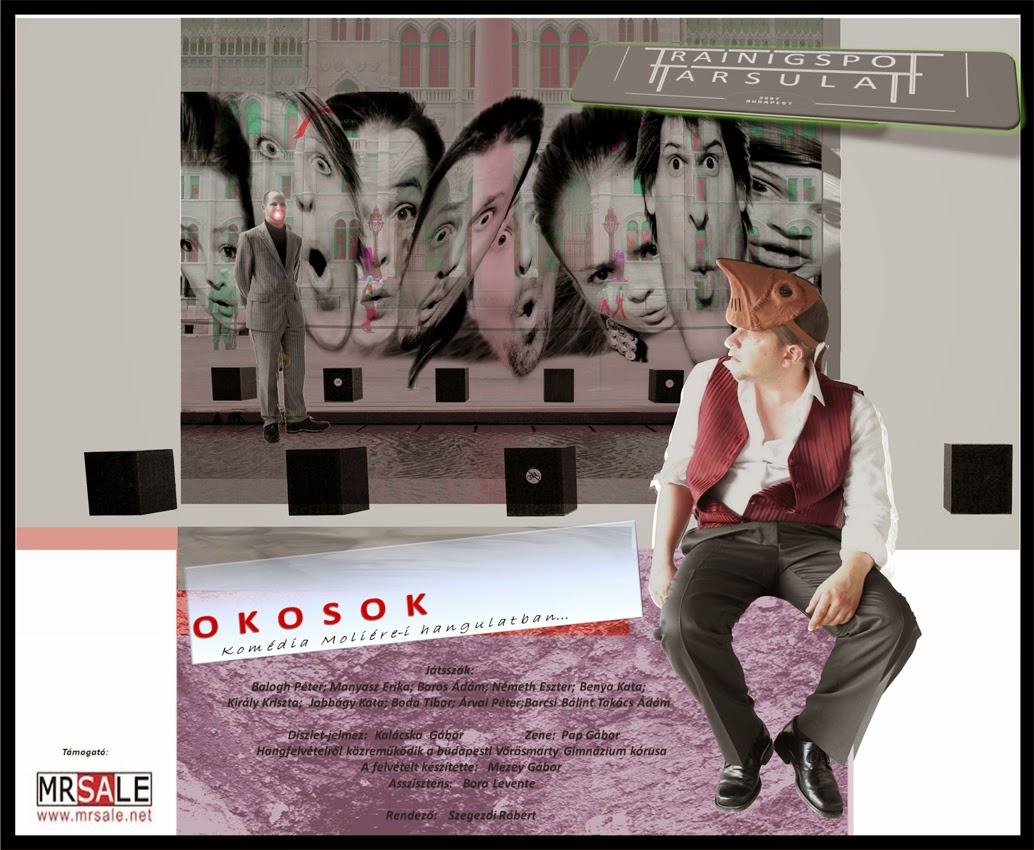 Milyen hatással van a család életére egy elévült világnézethez való makacs ragaszkodás? Van-e létjogosultsága a tudásnak, ha csak egyetemi szinten alkalmazható? Lehet-e boldog jövője a könyvek világában nevelkedett lánynak, aki elméleti síkon ismeri csak a szerelem fogalmát? Jobb parti-e az imádott fiatal művész, mint a testvérpár mindkét tagjával viszonyt folytató koronaőr? Ez a kérdéskör kergeti őrületbe és nyomja a családi guillotine alá Kajzert, az apát. Üzletemberként pedig az érkező Vaszilij lehet a kivégzője. Érvényesek-e a XXI. században a társadalomkritika nagy klasszikusának mulatságos tényfeltárásai? Eldöntheti a Trainingspot Társulat következő bemutatóján, Moliére A tudós nők c. színdarabjának mai formába adaptált OKOSOK című vígjátékának megtekintése után. Mi reménykedünk... Játsszák: Balogh Péter; Manyasz Erika; Boros Ádám; Németh Eszter; Benya Kata; Király Kriszta; Jobbágy Kata; Boda Tibor; Árvai Péter; Barcsai Bálint e.h.; Takács Ádám