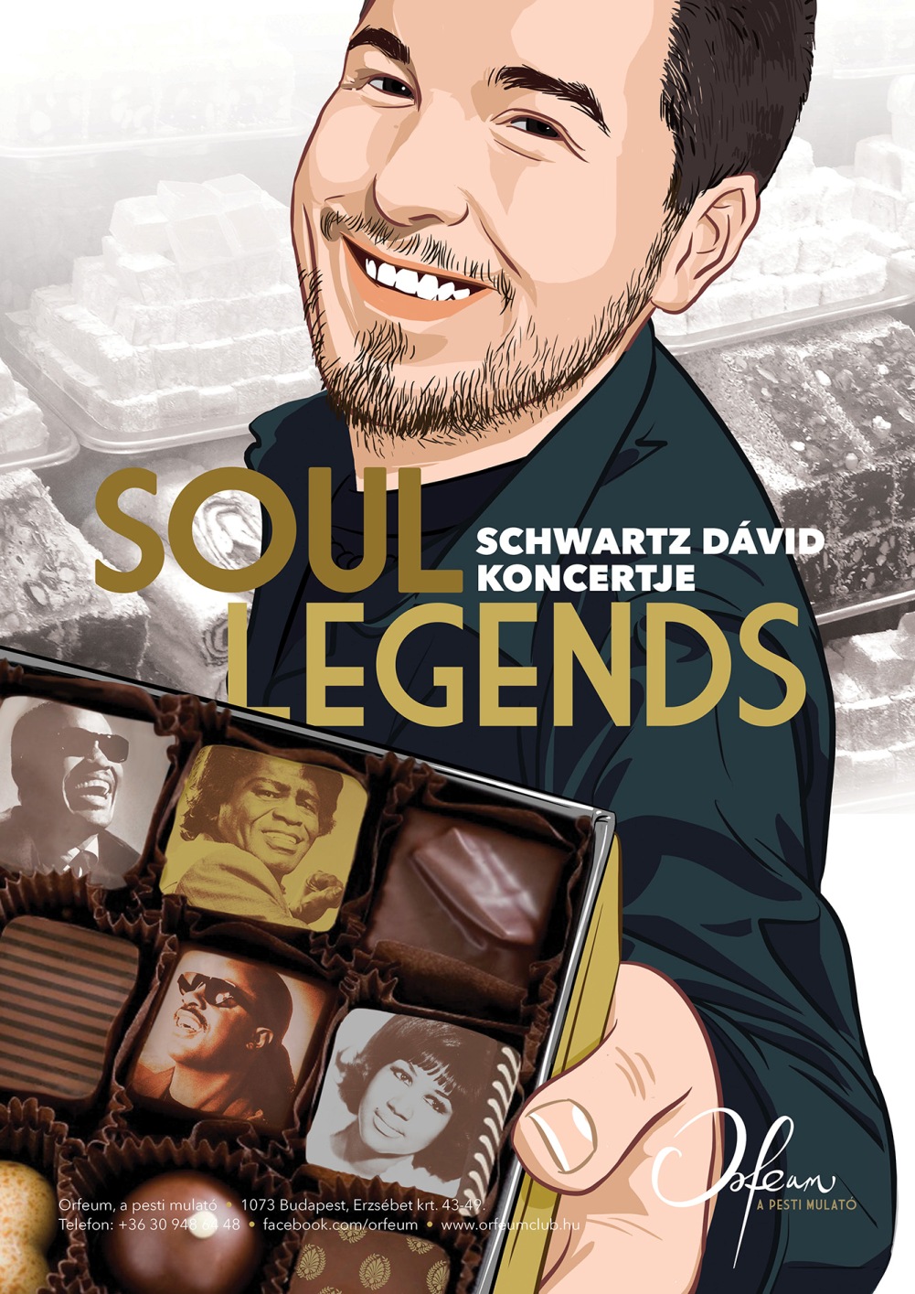 Schwartz Dávid Soul Legends című műsorával visszarepít a soulzene gyökereihez. A szintén fekte hangú Lelkes Reny-vel és zenekarával együtt időutazás-szerűen kalauzolnak el a műfaj nagy legendái között. A műfaj olyan jelentős ikonjait idézik meg, mint James Brown, Ray Charles, Aretha Franklin, Whitney Houston, Etta James, Chaka Khan, Tina Turner és Stevie Wonder. Ezen felül a Dreamgirls nagy balladái és pörgős nótái is terítékre kerülnek. A zenei paletta igen színes, az 1950-es évektől egészen napjaink szólnak az ismerős dallamok; ezért minden korosztálynak ajánljuk ezt az estet. A talp alá való hajnalig garantált, hiszen a koncert után DJ pörgeti a jobbnál jobb party-zenéket. A zenekar: Ének: Lelkes Reny Gitár: Derzsi Zsolt Dob: Oláh Gábor Basszusgitár: Szilva János Billentyűk: Tempfli Erik Kapunyitás 20 órakor Programkezdés 21 órakor Vacsorázási lehetőség 23 óráig Jegyárak: Prémium: 2.500 Ft Standard: 1.500 Ft Vendégeinknek a Corinthia Hotel Hársfa utca felől nyíló, őrzött parkolójában, 20 óra után 50%-os parkolási kedvezményt tudunk biztosítani a szabad helyek függvényében. Helyet előre foglalni nincs lehetőség. A kedvezmény igénybe vételéhez kérjük, távozás előtt adják át parkolójegyüket egyik kollégánknak, hogy lepecsételhessük, mielőtt azt a szálloda recepcióján érvényesítik! Felhívjuk kedves vendégeink figyelmét, hogy előre megváltott jegyek esetében az adott asztalhoz szóló foglalást a rendezvény meghirdetett kezdési időpontja után maximum 30 percig tudjuk garantálni. A meghirdetett kezdési időpont előtt jelzett késés esetén, természetesen érkezésig biztosítjuk a lefoglalt helyeket. Az előre nem megváltott jegyeknél az asztalfoglalást kizárólag a rendezvény meghirdetett kezdési időpontja előtt legalább 30 perccel történő érkezés esetében tudjuk biztosítani. Érkezéskor a regisztráció, valamint az őrzött ruhatár használata kötelező. Az egy adott rendezvényre szóló jegy megváltásával, valamint az azon történő részvétellel minden vendég tudomásul veszi a helyszínen kifüggesztett, illetve az Orfeum online-felületein közzétett szabályokat (házirend), s azok betartását magára nézve kötelezőnek tartja. A törvényi szabályozás értelmében, a rendezvényhelyszínre megállapított maximális vendéglétszámon felül érkező személyeket – előre megváltott jegyük ellenére – sem áll módunkban beengedni. Ezért is kérjük a pontos érkezést! Szeretnénk, ha programjaink egyre több vendéghez juthatnának el, így ennek érdekében a kommunikációnk részeként estjeinkről fotók készülnek. A vezetőség fenntartja a jogot a fotók felhasználásához, különösen az Orfeum weboldalán és Facebook-profiljainkon való megjelenítéshez. Amennyiben ezzel kapcsolatban ellenvetése van, kérjük, jelezze; ennek hiányában a hozzájárulás megadottnak tekintendő! Köszönjük! A műsorváltoztatás jogát fenntartjuk!