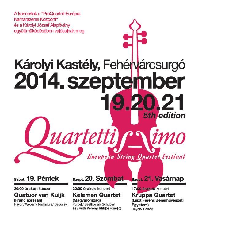 A fehérvárcsurgói Károlyi Kastély felújított koncertermében a Károlyi József Alapítvány 2014. szeptember 19-20-21-én szervezi meg a « Quartettissimo » 5. Európai Vonósnégyes Fesztivált. Minden évben a Fesztivál célja elősegíteni a klasszikus zenekultúra terjesztését, megismertetését Magyarországon, különös tekintettel a vonósnégyesekre, valamint a fiatal közönség zenei gyakorlatokba való bevonására, egyben fiatal zenészek számára nemzetközi kapcsolatépítési lehetőségek biztosítására, hiszen minden évben külföldi művészek is részt vesznek a rendezvényen. 2014-ben a Fesztivál az Európai Kulturális Örökség Napjai keretein belül zajlik. A program keretében három esti koncert kerül megrendezésre neves hazai és külföldi vonósnégyesek közreműködésével. Szeptember 19-én, pénteken a Quatuor van Kuijk (Franciaország) lép fel. Az együttes tagjai jelenleg a madridi Escuela Superior de Mùsica Reina Sofia növendékei, akik a Madridi Nemzetközi Kamarazenei Intézet (IIMCM) támogatásában részesülnek. A kvartett Haydn-, Webern-, Nishimura- és Debussy-darabokat játszik. Ezt megelőzően, a délután folyamán a székesfehérvári Hermann László Zeneiskola növendékeivel találkozik, hogy tapasztalatot cseréljenek a fiatal zenészekkel. Szeptember 20-án, szombaton az érdekfeszítő, fiatal (2010 alakult) Kelemen Quartet játszik, amely felvillanyozó fellépéséért és rendkívül interaktív játékáért elismerésben részesült, Purcell és Beethoven egy-egy művét, valamint a világhírű Perényi Miklóssal Schubert híres C-dứr vonósötösét adja elő. Szeptember 21-én, vasárnap a Kruppa Quartet, a Liszt Ferenc Zeneakadémia növendékeiből álló együttes ad koncertet (Haydn, Bartók), amely második alkalommal vendége a Fesztiválnak. A szombat reggeli és délutáni, ingyenes diákkoncerteken közreműködnek a budapesti Fasang Árpád Zeneiskola és a Hubay Jenő Zeneiskola, valamint a székesfehérvári Hermann László Zeneművészeti Szakközépiskola és AMI egykori és jelenlegi növendékei. Ezzel együtt az Alapítvány szeretne hozzájárulni a folytonosság fenntartásához a vonósnégyesek nagy magyar tradíciójában. A program keretében ingyenesen látogatható egy a vonósnégyes hangszereivel kapcsolatos bemutató Adonyi Iván, Etzler Bernd, Faragó-Thököly Márton és Romanek Tihamér jóvoltából. A rendezvényhez kapcsolódóan gyertyafényes vacsorák, vasárnap délután pedig „családi program” is lesz. Az 5. Európai Vonósnégyes Fesztivált a francia ProQuartet Egyesület együttműködésével Székesfehérvár MJV Önkormányzata és a budapesti Francia Intézet támogatja. Médiapartnerek: Duna Tv, Fehérvári Est, Fidelio Media. A programot mellékjük. További felvilágosítás: Károlyi József Alapítvány info@karolyikastely.hu; www.karolyi.org.hu; www.karolyikastely.hu; Tel. 06 21 311 04 26. Jegyárak: 3 000 Ft (kedvezményes: 2 300 Ft), ill. 7 500 Ft mindhárom koncertre.