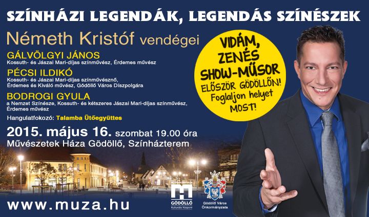 Fogadja el meghívásunkat egy vidám, sok nevetéssel és produkcióval tarkított különleges estére, május 16-án a gödöllői Művészetek Házába. Három Kossuth-díjas művész, akinek mestersége a színészet, most olyan területekre is betekintést engednek, amikre a nagyközönség eddig talán még egyáltalán nem láthatott be. Hangulatfokozó a Talamba Ütőegyüttes.