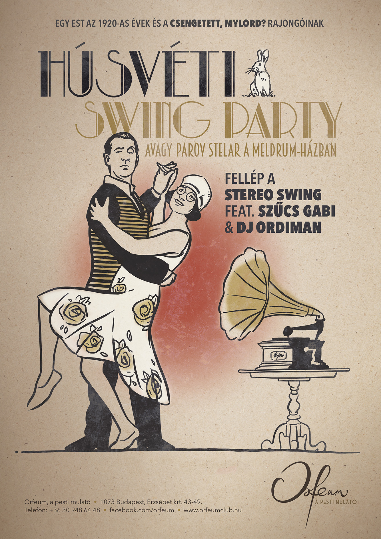 Képzeljünk el egy estet, amelyet Lord Meldrum lányai, Miss Cissy és Miss Poppy adnak a Kit Kat Clubban. A lemezjátszón Parov Stelar szól, a vendégek könnyű koktélt kortyolnak, a táncparketten lindy-hopot jár a nép. A vintage fanok számára a swing ma is szexi, XXI. századi hangzással frissítve sokakat vonz. Segítségével megidézzük az 1920-as évek hangulatát, a kedvelt Csengetett, Mylord?-sorozat korszakát. Egy party főuraknak és alagsoriaknak. Egy különleges hely, ahol együtt ropják komornák és komornyikok, lady-k és lordok, miss-ek és misterek. Az est kezdetén, műsorában a Stereo Swing formáció, azaz Szűcs Gabi, Koós-Hutás Áron, DJ Ordiman tökéletesen ötvözi a múlt ma is oly népszerű swingirányzatát napjaink divatos elektronikus hangzásvilágával, egy énekes, egy trombitás és egy dj közreműködésével. A műsor után DJ Ordiman válogat a legnépszerűbb Parov Stelar-dalokból és az electroswing hasonlóan nagyszerű muzsikáiból. Kapunyitás 22 órakor Programkezdés 23 órakor Jegyárak: Egységesen: 2.000 Ft Vendégeinknek a Corinthia Hotel Hársfa utca felől nyíló, őrzött parkolójában, 20 óra után 50%-os parkolási kedvezményt tudunk biztosítani a szabad helyek függvényében. Helyet előre foglalni nincs lehetőség. A kedvezmény igénybe vételéhez kérjük, távozás előtt adják át parkolójegyüket egyik kollégánknak, hogy lepecsételhessük, mielőtt azt a szálloda recepcióján érvényesítik! Felhívjuk kedves vendégeink figyelmét, hogy előre megváltott jegyek esetében az adott asztalhoz szóló foglalást a rendezvény meghirdetett kezdési időpontja után maximum 30 percig tudjuk garantálni. A meghirdetett kezdési időpont előtt jelzett késés esetén, természetesen érkezésig biztosítjuk a lefoglalt helyeket. Az előre nem megváltott jegyeknél az asztalfoglalást kizárólag a rendezvény meghirdetett kezdési időpontja előtt legalább 30 perccel történő érkezés esetében tudjuk biztosítani. Érkezéskor a regisztráció, valamint az őrzött ruhatár használata kötelező. Az egy adott rendezvényre szóló jegy megváltásával, valamint az azon történő részvétellel minden vendég tudomásul veszi a helyszínen kifüggesztett, illetve az Orfeum online-felületein közzétett szabályokat (házirend), s azok betartását magára nézve kötelezőnek tartja. A törvényi szabályozás értelmében, a rendezvényhelyszínre megállapított maximális vendéglétszámon felül érkező személyeket – előre megváltott jegyük ellenére – sem áll módunkban beengedni. Ezért is kérjük a pontos érkezést! Szeretnénk, ha programjaink egyre több vendéghez juthatnának el, így ennek érdekében a kommunikációnk részeként estjeinkről fotók készülnek. A vezetőség fenntartja a jogot a fotók felhasználásához, különösen az Orfeum weboldalán és Facebook-profiljainkon való megjelenítéshez. Amennyiben ezzel kapcsolatban ellenvetése van, kérjük, jelezze; ennek hiányában a hozzájárulás megadottnak tekintendő! Köszönjük! A műsorváltoztatás jogát fenntartjuk!