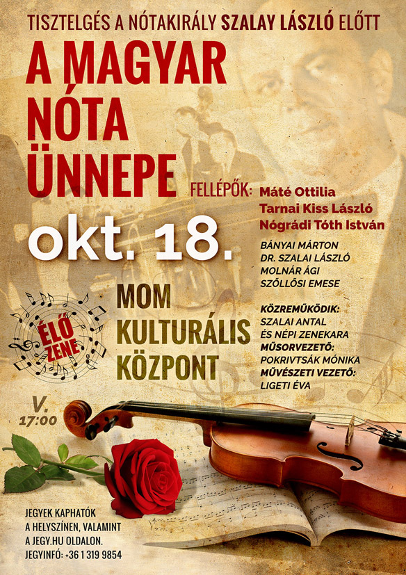Rengeteg találgatás van arról, hogy mióta beszélünk Magyar Nótáról, hogy mit is jelent maga ez a szó és persze arról is, hogy jelen van-e még az életünkben ez a műfaj, ez a kincs. Kodály Zoltán a fél életét azzal töltötte, hogy felkutatja ezeket a dalokat, amelyek még mindig a legnépszerűbbek hazánkban. Sokat hallani arról is, hogy a Magyar Nóta idejétmúlt a Magyar Nóta csupán az “öregek” kedvence, de ha a számok tükrében vizsgáljuk meg ezt a tényt, akkor ez egy rágalom, egy fals információ. Miért van az, hogy bármelyik vidéki városban meghirdetnek egy nóta estet arra pillanatok alatt elfogynak a jegyek? Miért van az, hogy a közönség egy-egy ilyen rendezvény után boldogan és elégedetten tér haza? Miért van az, hogy tudtunk nélkül ismerjük ezen dalok szövegeit? A válasz nagyon egyszerű: A Magyar Nóta jelen van, jelen volt és persze jelen lesz, az életünkben. Ahhoz pedig, hogy ez így is maradjon a műfaj elitje tesz most erről. Szalay László a 70-es évek Nótakirálya volt, aki ebben az évben lenne 100 éves. Szalay László a magyar nóta történetének meghatározó alakja. Kiemelkedőt alkotott énekesként, dalszerzőként és szövegíróként egyaránt. Nótái naponta csendülnek föl a rádióban, a televíziós kívánságműsorok örök kedvence, és az asztal mellett mulató társaságok a mai napig önfeledten éneklik dalait. Idén lenne 100 éves. Ő maga sosem szerette, ha őt ünnepelték, de az évforduló jó alkalom, hogy megemlékezzünk róla, és még inkább, hogy a magyar zenét ünnepeljük. Mivel rengeteg tanítványa volt és a szakma is megköveteli, így egy gálatestet szerveztek a tiszteletére, amelyet egybe kötöttek a Magyar Nóta Ünnepével. Bizonyosak lehetünk abban, hogy egy felejthetetlen este részese lesz az, aki ellátogat erre az eseményre. Tarnai-Kiss László, Máté Ottilia, Nógrádi-Tóth István, Szőllősi Emese és a nemrégiben országos nótaversenyt nyert Bányai Márton csak néhány név azok közül, akik szórakoztatni fognak Bennünket ezen az bulin. Ami még rendkívül érdekes információ, hogy a régóta Amerikában élő híres műsorvezető Pokrivtsák Mónika lesz az est ceremónia mestere. Azonban, hogy mi az összefüggés A Magyar Nóta, Szalay László és a műsorvezető között, azt majd csak az eseményen tudhatjuk meg. Az már csak hab a tortán, hogy a Szalai Antal és népizenekara kíséri majd az énekeseket, akik már Amerikában, Ausztráliában és Kanadában is megmutatták a közönségnek, hogy mit is jelent a Magyar Virtuozitás. Egyszónak is száz a vége: Ez az este kötelező! Egy évben egy alkalom van, amikor ekkor a “felhajtás” övezi a dalokat, nótákat és ez most 2015-ben október 18-án lesz A MOM Kulturális Központban Budapesten. A dolog szépsége, hogy a szervezők még arra is figyeltek, hogy ne kelljen késő éjszakáig este fent maradnunk, mert a rendezvény 17 órakor kezdődik. Jegyek a helyszínen a jegy.hu oldalon és az összes ismert jegyirodában kaphatók. Október 18 – A Magyar Nóta Ünnepe – Egy igazi, méltó ünneplés a műfaj legnagyobbjaival.
