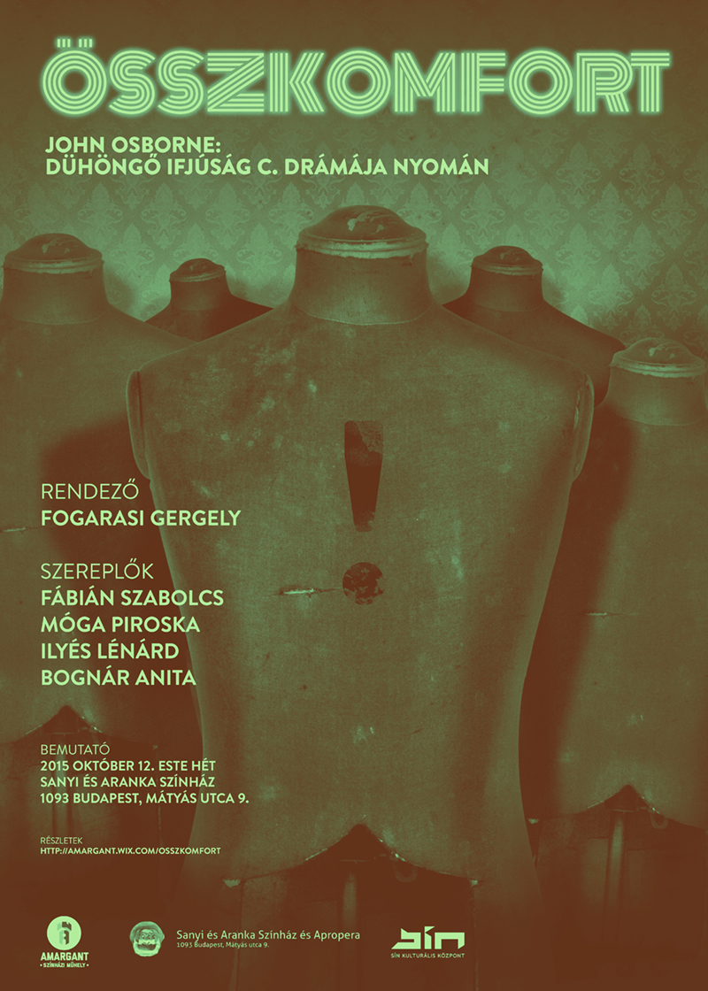 Összkomfort Babaház felnőtteknek. Lehet-e összkomfortban élni hárman, egy lepukkant, pesti albérlet poklának tornácán? Lehet-e boldogan élni, ha minden világmegváltó tervünk dacára tengődünk a huszas-harmincas éveink közepén, egzisztencia és kilátások nélkül? Lehet-e érvényesen élni egy társadalomban, ahol épp a fiatal generációnak nincs se tere, se energiája, és igazán kedve se a változtatásra? Négy ember, önmaguk és egymás folytonos élveboncolásában. Az előadás, melynek alapjául John Osborne: Dühöngő ifjúság című drámája szolgál, annak a társadalomnak tesz fel kérdéseket, amiben mi magunk is élünk, ahol mindannyian létre szeretnénk hozni a saját komfortzónánkat. Bővebben: http://amargant.wix.com/osszkomfort