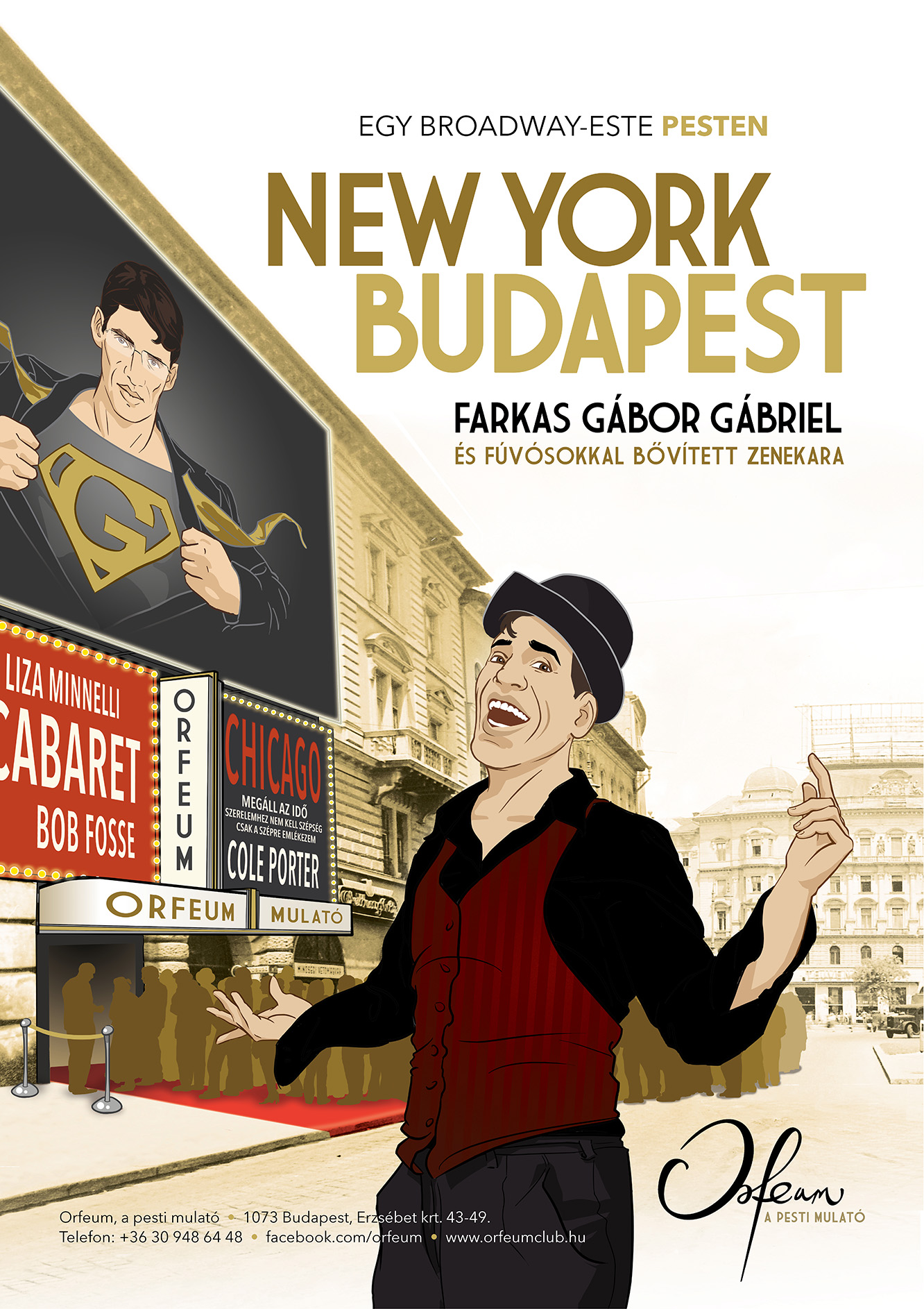http://orfeum.hu/event/new-york-budapest-farkas-gabriel-2016-07-09/ https://www.facebook.com/events/1743715595840543/ Kis nézőtér, kis színpad, nagy tehetség. Szinte nem is Budapesten vagyunk, és nem az Orfeumban ülünk. Farkas Gábriel elvisz bennünket, a hangjával együtt repülünk, és igen, épp a Broadway-n járunk, New York felhőkarcolói között sétálunk. A zenekar, a hangzás, a fények, a hely, vagy talán ez az ital? Szinte szédítő. Hát persze… Épp azt halljuk: And The World Goes ’Round… Az Orfeumban ilyen egy pesti Broadway-este. Kapunyitás 20 órakor Programkezdés 21 órakor Vacsorázási lehetőség 23 óráig Jegyárak: Prémium: 2.800 Ft Standard: 1.800 Ft Foglalási információk: http://orfeum.hu/foglalas/#altalanos A műsorváltoztatás jogát fenntartjuk!