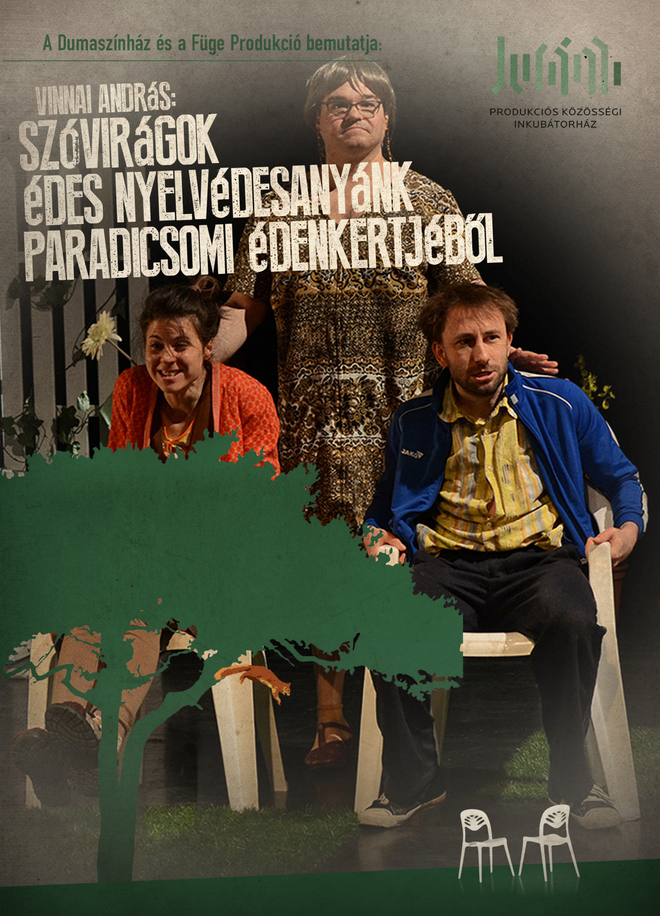 (Figyelem! A helyesírási hibák nem lyavítandók!) Feri és Teri nem álnak a verbális komunikáció csucsán. Ezért is szeretnének inkább leülni valamire, de viszont székük az meg nincsen nekik. Miután elopják a szomszédos telekről a két napszídta műanyag ülőalkalmatosságot, gyökeressen megváltozik a életük. A kert tulajdonosa ugyanis nem más, mint Nyelvédesanyánk, aki amellette, hogy serényen gyomlál és ojtogat varázslatos szóvirágoskertjében, nem rest a tettek mezejére lépni, ha az emberi nyelv sorsa forog kockán. Márpedig valaki nem írja, hanem irtja a szavakat! Tanúlságos történetünkből kiderül, maradt-e eséj szavaink megovására, vagy talán nem marad írmaglyuk se nem? Lyöllyön el és megtuggya! Nyelvünk gazdagsága, kommunikációs lehetőségeink burjánzó veteményes kertje ihlette, hívta életre e tanulságos, s egyszersmind mosolyfakasztó történetet, amely az emberi beszéd eszközeivel szólítja meg nézőit, s hívja önfeledt, ugyanakkor felelősségteljes játékra mindazokat, akik szívükön, s ajkukon viselik a verbális információáramlás sorsát, s akik nem fordulnak el az emberi diskurzus építőköveinek az évezredek során tükörré csiszolt felületétől, mely visszavetíti reánk, emberekre mindazt, ami a kimondott szót történelemmé, a tudást átörökíthető kinccsé, s az érzelmek megfejthetetlennek tűnő labirintusát feltérképezvén a lélek bedekkerévé, a szellem iránytűjévé, az elme használati utasításává válva az emberi megnyilvánulás kvintesszenciájává párolja azon rendszerek színes kavalkádját, melyek az emberiség társául szegődtek az első kimondott szó óta, s annakutána mind az összes megelőző, s az azt követő eszmékből, gondolatfoszlányokból szabva ki azt az erős, ám nagyon is sérülékeny vitorlát, melyet modern korunk csapongó nyelvi szelei dagasztanak kövérre, vagy épp szaggatnak cafatokra, miközben mi, anyanyelvünk hajójának legénysége, kik egyszerre állunk a parancsnoki hídon, vagy épp súroljuk a fedélzet deszkáit, ki-ki műveltsége, intelligenciája szerint elfoglalva helyét s posztját végtelen utazásaink során, talán megpillantjuk a távolba vesző partokat, s a nyelvi entrópia pusztító zátonyai közt navigálva, de soha meg nem torpanva harsogjuk, hogy el nem némulunk, míg szájunk mozog, s hangszálunk feszül, beszélni kívánunk, ajkunk szavakat szül, s bábáskodva igék s főnevek fölött, mint szőttest, melyet jó anyánk kötött, magunkra vesszük nyelvünk vértezetét, nem hagyjuk el szavaink büszke ékezetét még akkor sem, ha csak rövid szöveges üzenetet írunk a pajtásainknak. Mert erős cérnával van ám az a vitorla megvarrva! Színészek: Bánki Gergely, Elek Ferenc (a Katona József Színház színésze), Sipos Vera Írta: Vinnai András Jelmez: Juhasz Dóra Díszlet: Kálmán Eszter Animáció: Kolozsvári Balint Munkatárs: Fazekas Anna Műszaki munkatárs: Fábián Gábor Zoltán Rendező: Kálmán Eszter