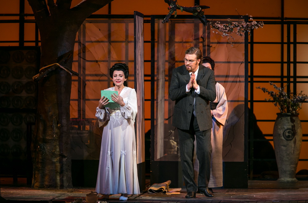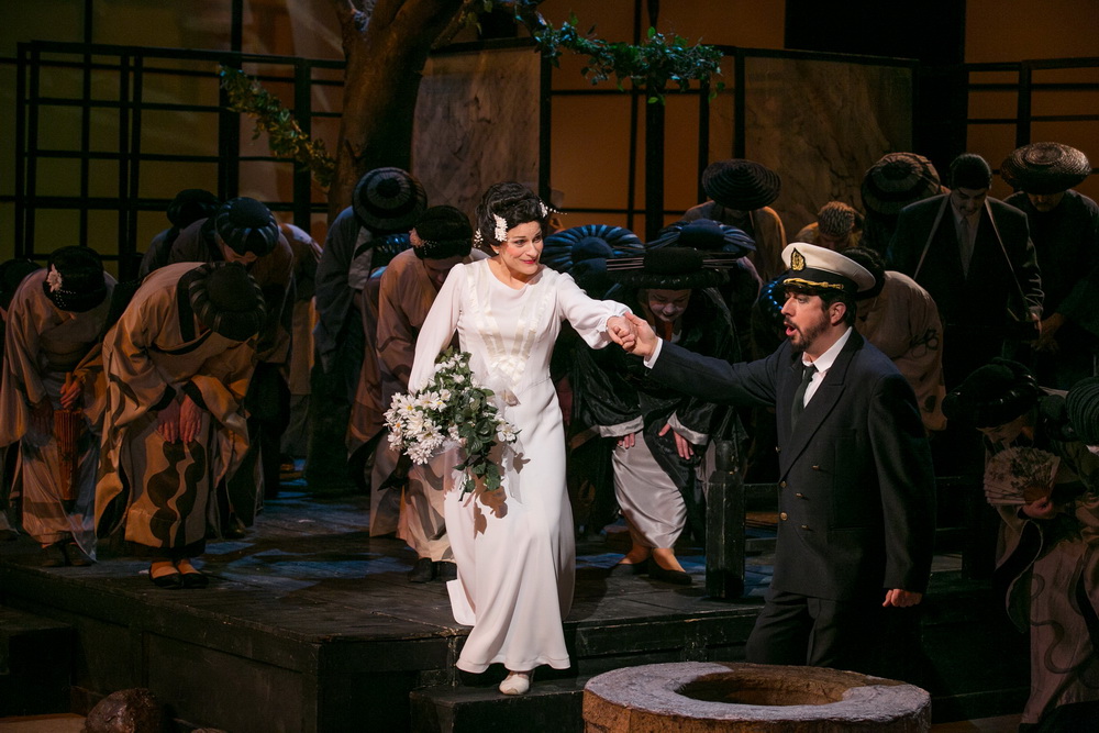 Pinkerton amerikai tengerészhadnagy hajója Nagaszaki kikötőjében állomásozik. A fiatal tiszt arra használja fel ezt az alkalmat, hogy japán módra „házasságot” kössön Cso-Cso szannal, egy elszegényedett főnemesi családból származó gésával. Az üzletet, mely szerint 999 évre a házat és a telket is bérbe vette, de melyet bármely pillanatban fel is mondhat, Goro, a hivatásos leánykereskedő és házasságközvetítő ütötte nyélbe. Az amerikai konzul figyelmezteti Pinkertont, hogy a leány komolyan veszi a házasságot, s ezért a keresztény vallást is felvette. Pinkertont nemigen hatják meg a komoly szavak. Mialatt „menyasszonyát” várja, lelkiismeretfurdalás nélkül iszik leendő „igazi” amerikai felesége egészségére. Megérkezik barátnőivel Cso-Cso szan, majd a rokonság, aztán megkezdődik a valóban praktikusan egyszerű házassági szertartás. Alig távoztak a hatóság emberei, beront az új asszonyka nagybátyja, a szerzetes. Már értesült unokahúga végzetes lépéséről, s kiátkozza a szerencsétlent. Pinkerton kiutasítja a felbőszült csendháborítót, s vele együtt az egész „új rokonságot”. Butterfly lassan magához tér, bánata felenged, és a csillagfényben tündöklő éjszakában boldogan követi „férjét” a házba.