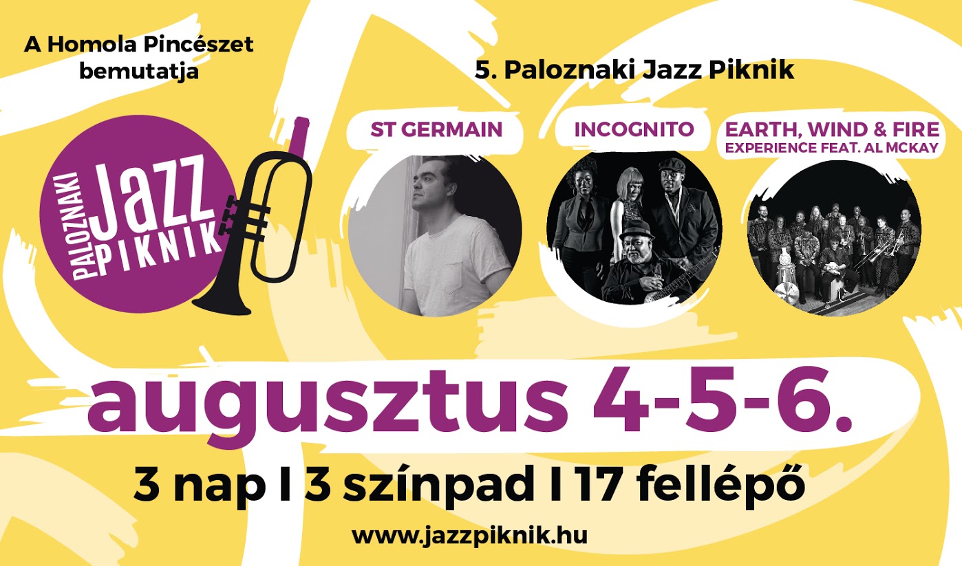 Idén nyáron három napra Paloznak lesz a jazz balatoni fővárosa: a Paloznaki Jazz Piknik ismét világsztárokkal teli programmal készül. Az 5. évfordulót egy különleges nulladik nappal nyitjuk: a francia Ludovic Navarre house és nu jazz formációja, a világhírű St Germain ad koncertet a nagyszínpadon (a nulladik napra külön jegy is váltható). A sort pénteken és szombaton izgalmas nemzetközi és hazai előadókkal folytatjuk, augusztus 5-én fellép a brit acid jazz csapat, az Incognito, 6-án pedig az Earth, Wind & Fire Experience feat. Al McKay, minden idők legsikeresebb soul-funk-disco zenekarának repertoárjával. A 3 nap alatt 3 színpadon 17 zenei produkcióval készülnek a szervezők. Fellép a Váczi Eszter Quartet, akik egyszer már megtáncoltatták a Jazz Piknik közönségét, a naplementés koncertek „szakértője” a Bin-Jip, Csemer Boggie, a Pankastic!, Marge, a Belau, a Kéknyúl Hammond Band, a Szőke Nikoletta Quartet, a Juhász Gábor trió, valamint Jász András és Barátai. A Sáfránkert Vendéglő melletti színpadon pedig fiatal tehetségek zenélnek majd egy vagy kétszemélyes formációkban. A Jazz Piknik a gasztronómiában is a minőséget képviseli, az északi part legigényesebb éttermei és kézműves termelői biztosítják majd a harapnivalókat, a piknikhangulatot pedig piknikkosarak, behűtött borok, helyi termelői finomságok és plédek teszik teljessé. A fesztivál borkínálatának alapját a házigazda Homola Pincészet borai adják, emellett kaphatók lesznek a környékbeli legjobb pincészetek válogatott borai is. 2016. augusztus 4. Nagyszínpad: