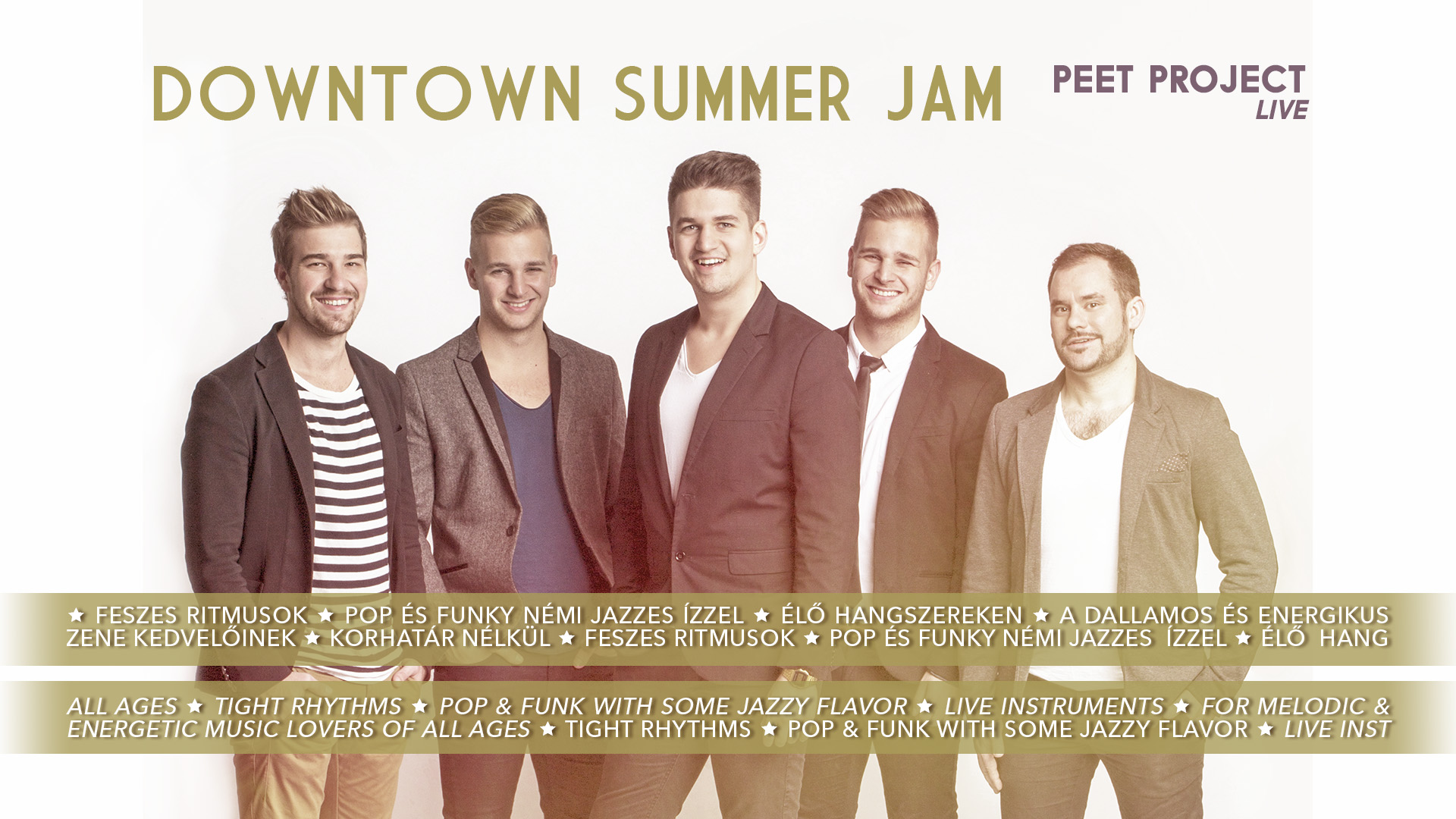 Feszes ritmusok, pop és funky némi jazzes ízzel, élő hangszereken, a dallamos és energikus zene kedvelőinek, korhatár nélkül.