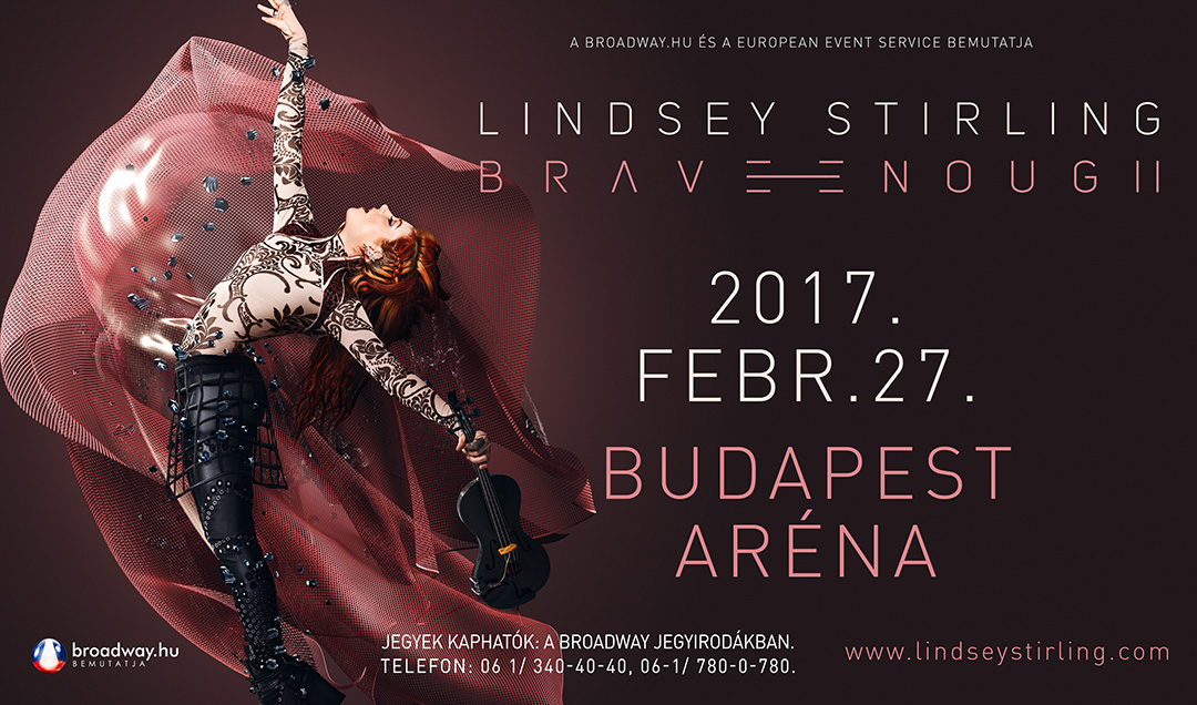 A hegedű csodálatos hercegnője visszatér! Lindsey Stirling továbbra is rettenthetetlen, mindig mer nagyot álmodni. A saját neve alatt 2012-ben kiadott album megjelenése óta eltelt négy évben az elektronikus zene impresszáriója, a komolyzenei képzettséggel rendelkező hegedűs, táncos művész csendben, szerényen a XXI. század egyik leginnovatívabb sztárja lett, mert nem tért el a moziélményt nyújtó, hegedűalapú elektronikus zene grandiózus eszményétől. Legújabb turnéja 2017 február 27-én érkezik a Papp László Budapest Sportarénába. Miután a Billboard Top 200 slágerlistán a 2. helyre, a Dance/Electronic Album slágerlistán 1. helyre ugrott, a Classical Album slágerlistán pedig 21 egymást követő hétig tartotta 1. helyét és a legjobb Dance/Electronic albumnak járó Billboard Music Award díjat is elhódította, a „Shatter Me” c. albuma a RIAA szervezet kritériumai alapján aranylemez lett. A YouTube videomegosztó platformján 2016 elejére közel 8 millió feliratkozóval és több mint 1,3 milliárd megtekintéssel Lindsey a 4. helyet kapta a YouTube-művészek aktuális Forbes listáján, így ő lett a legjobb helyezést elérő nő. A címlapokra kerülő turnéján összesen több mint 500 ezer fő előtt játszik, első irodalmi műve – a testvérével, Brook S. Passey-vel közösen írt „The Only Pirate at the Party” c. könyve – felkerült a New York Times bestseller-listájára. Elképesztő sikerű videói és turnéi közben készült el új albuma a Brave Enough, mely érettebben ugyan, de elődje fonalát igyekszik felvenni. 2015-ös turnéja befejezése után 2015 augusztusában legjobb barátja és zongoristája, Gavi, kórházba került és nem sokkal később tragikus módon elhunyt. Hatása, szellemisége az egész kreatív folyamaton kitörölhetetlen nyomot hagyott. „Ez volt életem legnehezebb időszaka” – meséli - „A munkába akartam temetkezni, érzelmeimet el akartam rejteni. Szembesülnöm kellett velük, időt kellett adnom, hogy leülepedjenek a dolgok, majd kifejezésre kellett juttatnom őket.” A végeredmény egyszerre virtuóz és egyben robban szét az energiától. A történet ott folytatódik, ahol a Shatter Me-nél abbamaradt. A balerina kitört a hógömbből, így most egy új világban új örömökkel és új félelmekkel szembesül. A színpadon mindíg kecses, lehengerlő amerikai Művésznő koncertjeit világszerte nagy várakozás övezi. 2015-ös hatalmas budapesti sikere után nem volt kérdés a folytatás. Lindsey Stirling egyedi előadóstílusa, bája és lehengerlő energiái ismét rabul ejtik az Aréna közönségét 2017 február 27-én.