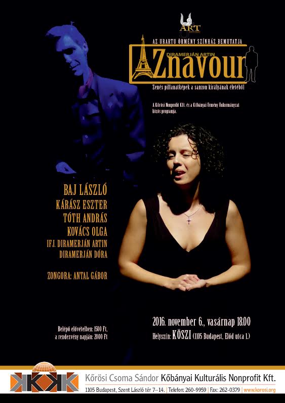 A Kőrösi Nonprofit Kft. és a Kőbányai Örmény Önkormányzat közös rendezvénye az Országos Örmény Önkormányzat támogatásával. Az Urartu Örmény Nemzetiségi Színház a magyarországi örmények önkéntes szerveződése, céljuk az örmény kulturális örökség megőrzése, hagyományaik ápolása. Az intézmény vezetősége olyan különleges, keleti világú színházat hozott létre, amely a magyar emberek számára ez idáig ismeretlen volt. Előadásaik során úgy mutatják be az örmény kultúrát – zenét, irodalmat, színdarabokat –, hogy az a magyar emberek számára is érdekes és élvezetes legyen. Törekszenek a kétnyelvűségre, a színes változatos programokra. Ezúttal a francia sanzon koronázatlan királya, az örmény származású Charles Aznavour életének pillanatképeit fűzik egybe a művész gyermekkorától a világhírnévig. Azét az Aznavourét, aki táncosként és gyermekszínészként kezdte pályáját, több tucat filmben szerepelt, majd énekesként vált világsztárrá, és idén töltötte be 92. életévét. Aznavour egy élő legenda, aki nemcsak énekli, de maga is írja a dalait. Az Urartu Színház előadása több, mint egyszerű sanzon-est. Igazi színházi produkció maradandó pillanatokkal, örökérvényű dalokkal és feledhetetlen színészi alakításokkal. Szereplők Charles Aznavour: Baj László Edith Piaf: Kárász Eszter Chévalier, Pierre Roche: Tóth András Amerikai újságírónő, nőalakok: Kovács Olga A gyermek Aznavour: ifj. Diramerján Artin Aida, Aznavour nővére: Diramerján Dóra Zongorán közreműködik: Antal Gábor Írta és rendezte : Diramerján Artin Belépő: elővételben 1500 Ft, a program napján, a helyszínen 2000 Ft Helyszín: KÖSZI (1105 Budapest, Előd utca 1.)