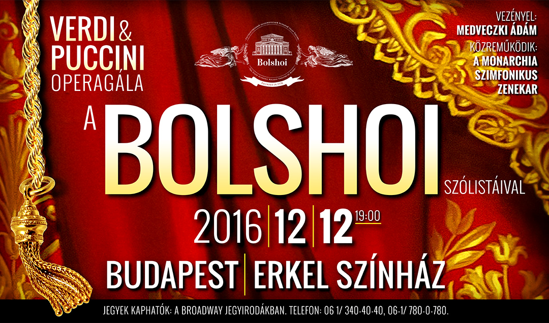 A moszkvai Nagyszínház a világ leghíresebb operaházainak egyike, Oroszország vezető zenés színháza. A moszkvai Bolshoi szólista énekesei a világ legismertebb színházainak állandó vendégfellépői végre Magyarországra, Budapestre is ellátogatnak. Az operagálán a Bolsoj szólistáitól részleteket hallhatunk a legnépszerűbb olasz operákból: Tosca, Traviata, Turandot, Bohémélet, Rigoletto, Aida. Fellépő művészek: Elena Zelenskaja, Svetlana Shilova, Olga Abramova, Andrej Grigorjev, Roman Muravickij, Aleksey Nekludov Az operagálán Medveczky Ádám, Kossuth – díjas karmester vezényel, közreműködik a 60 fős Monarchia Szimfonikus Zenekar.