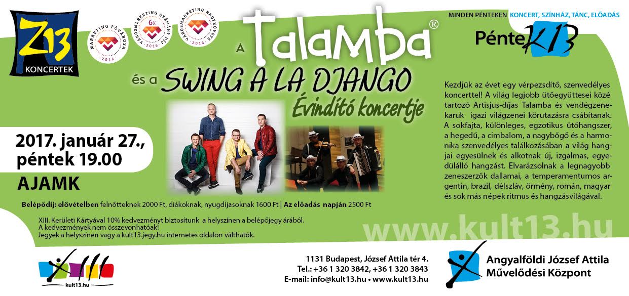 Kezdjük az évet egy vérpezsdítő, szenvedélyes koncerttel! A világ legjobb ütő együttesei közé tartozó Artisjus - díjas Talamba és vendégzenekaruk igazi világzenei körutazásra csábítanak.