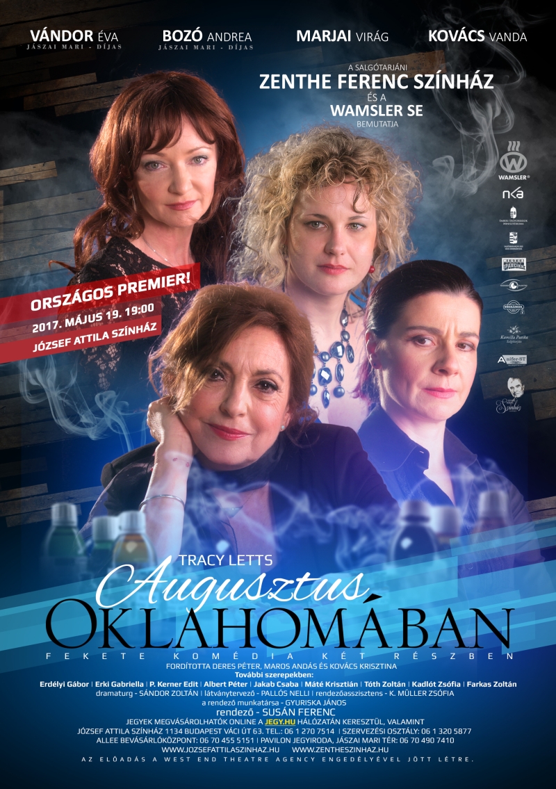 Az elmúlt évek egyik legnagyobb amerikai Broadway-sikere volt Tracy Letts 2007-ben bemutatott, többszörös Tony- és Pulitzer-díjas tragikomédiája. A fanyar humorú, sziporkázó párbeszédekkel teletűzdelt színművet ezúttal a salgótarjáni Zenthe Ferenc Színház előadásában láthatja a nagyérdemű, a József Attila Színház színpadán. Az Augusztus Oklahomában izgalmas krimi, frenetikus vígjáték, megrendítő családi dráma és igazi amerikai mese egyszerre egy alkoholista apáról és egy gyógyszerfüggő anyáról, akik megpróbálnak rendet tenni maguk körül.