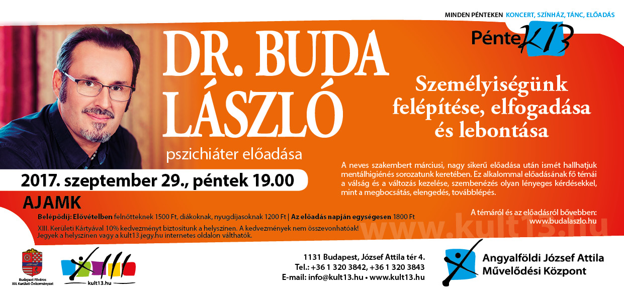 A neves szakembert tavaszi, nagy sikerű előadása után ismét hallhatjuk mentálhigiénésvsorozatunk keretében. Ez alkalommal előadásának fő témái a válság és a változás kezelése, szembenézés olyan lényeges kérdésekkel, mint a megbocsátás, elengedés, továbblépés. A témáról és az előadóról bővebben: www.budalaszlo.hu.