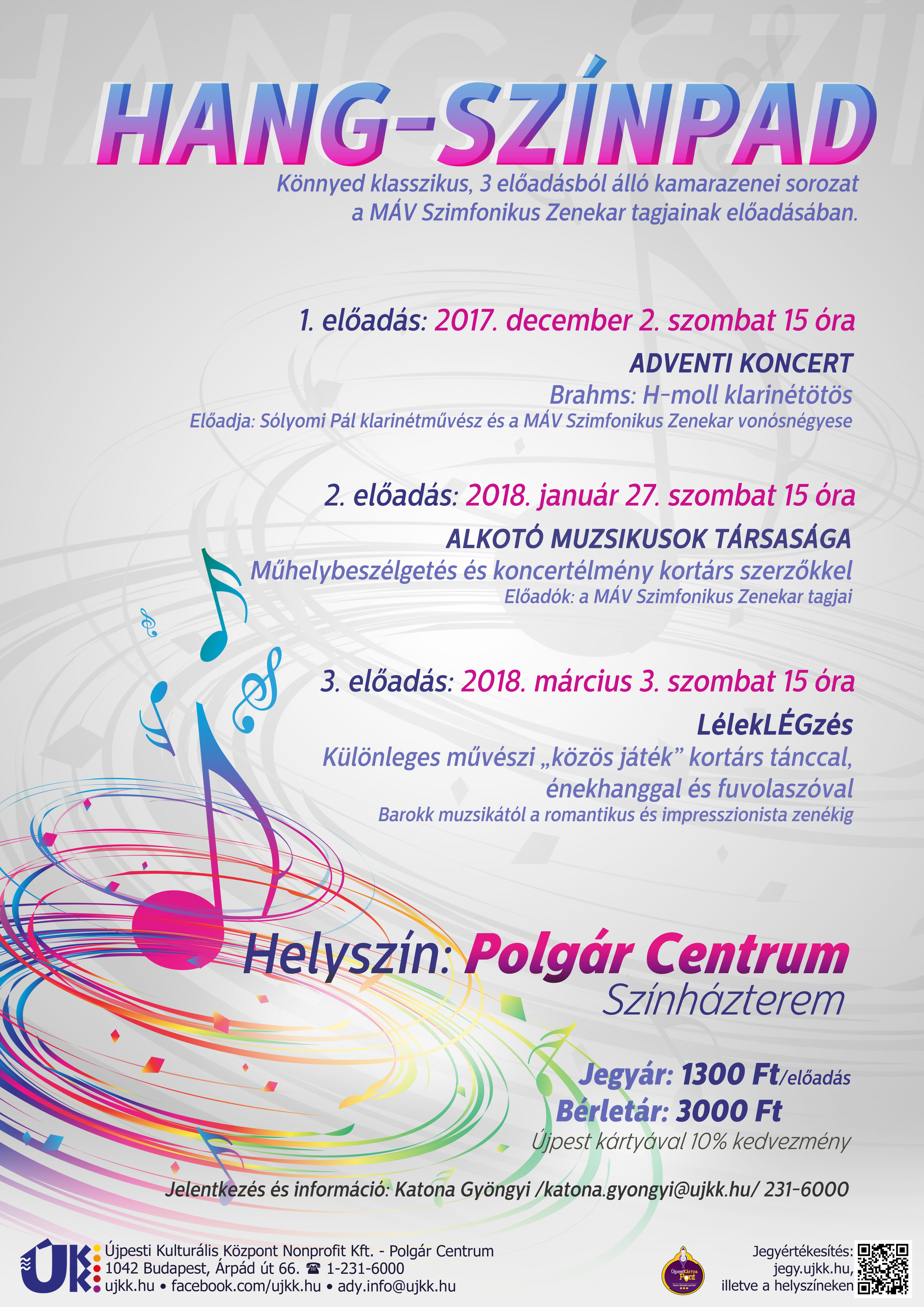 A Polgár Centrum Hang-Színpad előadásai különleges művészi élménnyel várják a kedves nézőket. Nem hangversenyek a szó általános értelmében, ahol a hallgató figyelmesen ül, majd hazamegy. Beavató előadások ezek, ahol a műsorvezető segítségével megismerjük a zeneszerzők életét, lelkivilágát, valamint az előadók kapcsolatát hangszereikkel és a zeneművészettel.