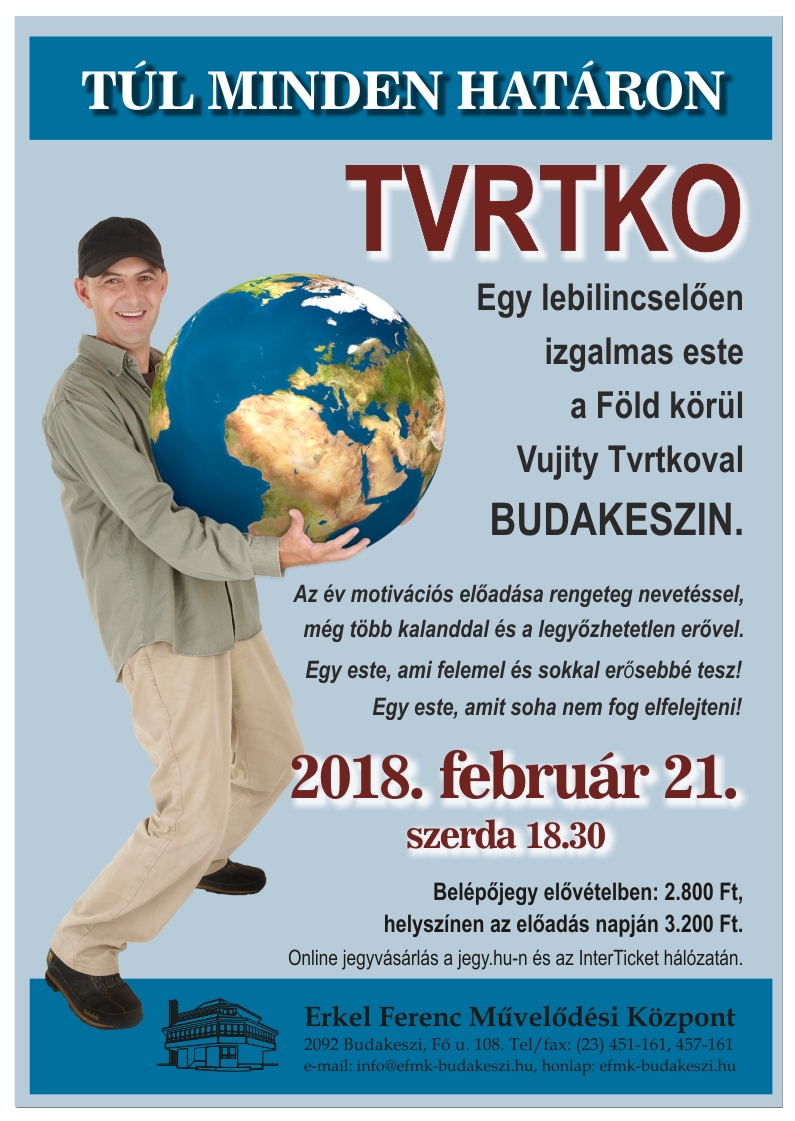 „Túl minden határon” egy lebilincselően izgalmas este a Föld körül Vujity Tvrtkoval. Az év motivációs előadása rengeteg nevetéssel, még több kalanddal és a legyőzhetetlen erővel. Egy este, ami felemel és sokkal erősebbé tesz! Egy este, amit soha nem fog elfelejteni!