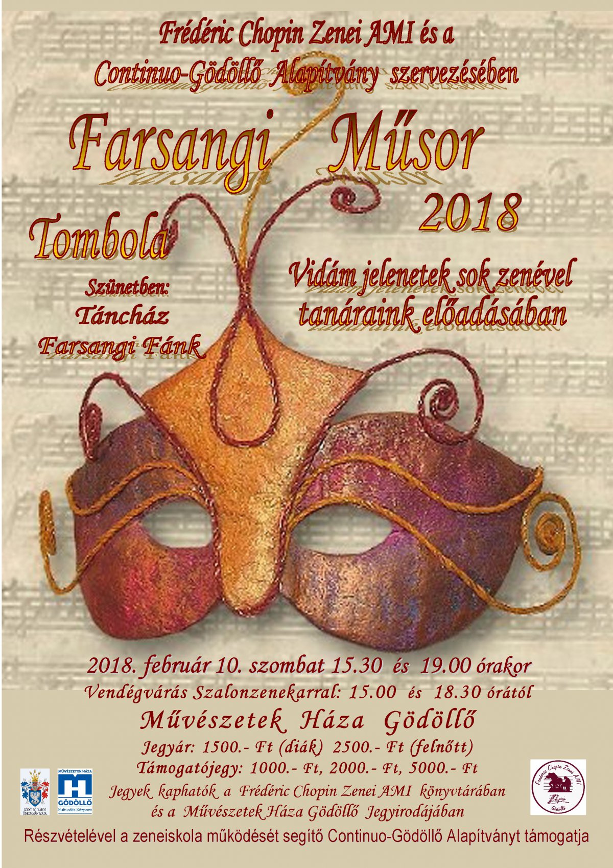 Több mint 20 éve kerül megrendezésre a gödöllői zeneiskola vidám farsangi műsora, ahol zenével, tánccal és kacagtató jelenetekkel szórakoztatja közönségét a zeneiskola tanári kara, egészen más oldalról bemutatkozva, mint ahogyan azt megszoktuk Tőlük a hétköznapokban.